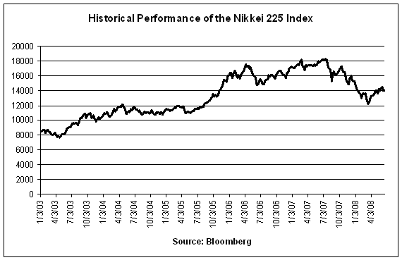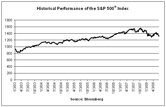 The following graphs show the historical weekly performance of each Basket Index as well as the Basket as a whole from January 3, 2003 through June 20, 2008. The graph of the historical Basket performance assumes the Basket level on January 3, 2003 was 100 and that each Basket Index had the component weightings specified in this term sheet on that date. The closing level of the S&P 500® Index on June 25, 2008 was 1321.97. The closing level of the Dow Jones EURO STOXX 50® Index on June 25, 2008 was 3460.10. The closing level of the Nikkei 225 Index on June 25, 2008 was 13829.92. The closing level of the S&P GSCITM Excess Return Index on June 25, 2008 was 1003.65. We obtained the various index closing levels and other information below from Bloomberg Financial Markets, and accordingly, make no representation or warranty as to their accuracy or completeness.