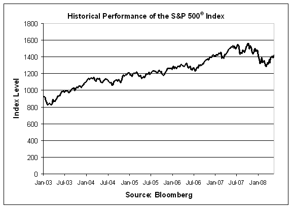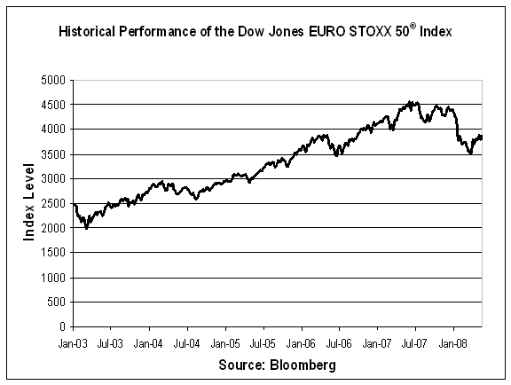The following graphs show the historical weekly performance of the S&P 500® Index and the Dow Jones EURO STOXX 50® Index from January 4, 2002 through May 16, 2008 and the S&P BRIC 40 Index as well as the Basket as a whole from February 6, 2004 through May 16, 2008. The S&P BRIC 40 Index was officially launched by Standard & Poors, a division of The McGraw-Hill Companies, Inc. (S&P), on June 20, 2006, and S&P makes available hypothetical backtested historical data for the weekly performance of the S&P BRIC 40 Index back to February 6, 2004. The graph of the historical Basket performance assumes the Basket level on February 6, 2004 was 100 and that each Basket Index had a 1/3 weight in the Basket on that date. The closing level of the S&P 500® Index on May 16, 2008 was 1425.35. The closing level of the Dow Jones EURO STOXX 50® Index on May 16, 2008 was 3862.91. The closing level of the S&P BRIC 40 Index on May 16, 2008 was 3357.44. We obtained the various index closing levels and other information below from Bloomberg Financial Markets, and accordingly, make no representation or warranty as to their accuracy or completeness.