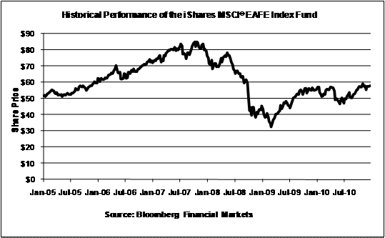 The following graph sets forth the historical performance of the iShares® MSCI EAFE Index Fund based on the weekly closing price of one share of the Index Fund from January 7, 2005 through December 23, 2010. Due to an exchange holiday on December 24, 2010, the following graph shows the historical performance of the Index Fund based on the weekly closing price of the Index Fund through December 23, 2010. The closing price of one share of the Index Fund on December 29, 2010 was $58.15. We obtained the Index Fund closing prices below from Bloomberg Financial Markets. We make no representation or warranty as to the accuracy or completeness of the information obtained from Bloomberg Financial Markets.