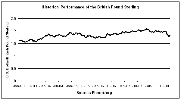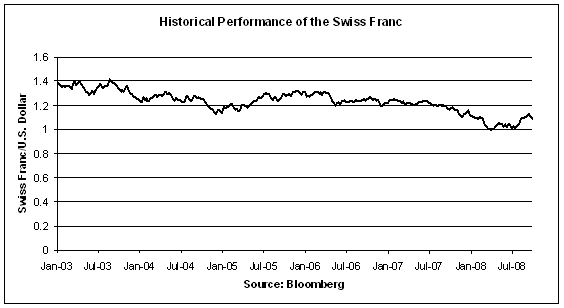 The first four graphs below show the historical weekly performance of each Basket Currency expressed in terms of the conventional market quotation, as shown on Bloomberg Financial Markets, for each currency (which, in the case of the British Pound Sterling (GBP) and the European Union Euro (EUR), is the amount of U.S. dollars that can be exchanged for one unit of the applicable Basket Currency, and in the case of the Japanese Yen (JPY) and the Swiss Franc (CHF), is the amount of the applicable Basket Currency that can be exchanged for one U.S. Dollar, and which, in each case, we refer to in this term sheet as the exchange rate) from January 3, 2003 through September 26, 2008. The exchange rates of the British Pound Sterling, the European Union Euro, the Swiss Franc and the Japanese Yen, at approximately 11:00 a.m., New York City time, on October 2, 2008, were 1.75815, 1.38025, 1.1376 and 105.285, respectively.
