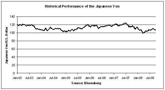 The last graph below shows the weekly performance of the Basket from January 3, 2003 through September 26, 2008, assuming that the Basket Closing Level on January 3, 2003 was 100, that each Basket Currency had a 1/4 weight in the Basket on that date and that the closing spot rates of each Basket Currency on the relevant dates were the Spot Rates on such dates. The closing spot rates and the historical weekly Basket performance data in such graph were determined by, for the Japanese Yen and the Swiss Franc, the rates reported by Bloomberg Financial Markets and, for the British Pound Sterling and the European Union Euro, dividing one by the rates reported by Bloomberg Financial Markets, and may not be indicative of the Basket performance using the Spot Rates of the Basket Currencies at approximately 6:00 p.m., New York City time (or, solely with respect to the Spot Rates on the pricing date, at approximately 11:00 a.m., New York City time, on such date), that would be derived from the applicable Reuters page.