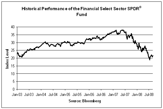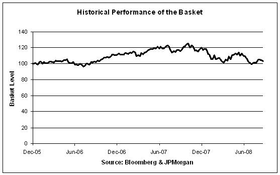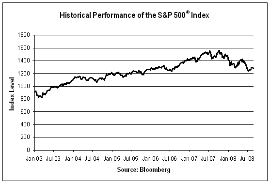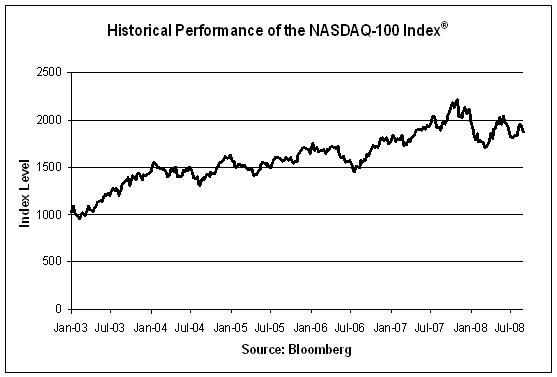 The following graphs show the historical weekly performance of the S&P 500® Index, the NASDAQ-100 Index® and the Financial Select Sector SPDR® Fund from January 3, 2003 through August 29, 2008, as well as the historical weekly performance of the PowerShares Water Resources Portfolio and the Basket as a whole from December 9, 2005 (the inception date of the PowerShares Water Resources Portfolio was December 6, 2005) through August 29, 2008. The graph of the historical Basket performance assumes the Basket level on December 9, 2005 was 100 and the Component Weightings specified on the cover of this term sheet on that date. The closing level of the S&P 500® Index on September 2, 2008 was 1277.58. The closing level of the NASDAQ-100 Index® on September 2, 2008 was 1850.14. The closing price of the PowerShares Water Resources Portfolio on September 2, 2008 was $21.74. The closing price of the Financial Select Sector SPDR® Fund on September 2, 2008 was $21.72.