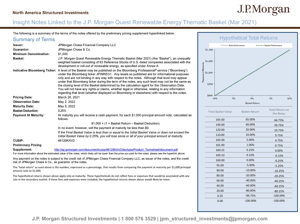 H The following is a summary of the terms of the notes offered by the preliminary pricing supplement hyperlinked below. Summary of Terms Issuer: JPMorgan Chase Financial Company LLC Guarantor: JPMorgan Chase & Co. Minimum Denomination: $1,000 Basket: J.P . Morgan Quest Renewable Energy Thematic Basket (Mar 2021) (the “Basket ”), an unequally weighted basket consisting of 63 Reference Stocks of U.S. - listed companies associated with the development or roll - out of renewable energy, as specified under Annex A Indicative Bloomberg Ticker: A level of the Basket may be published on the Bloomberg Professional ® service (“Bloomberg”) under the Bloomberg ticker JPINREG1 . Any levels so published are for informational purposes only and are not binding in any way with respect to the notes. Although that level may appear under that Bloomberg ticker during the term of the notes, any such level may not be the same as the closing level of the Basket determined by the calculation agent for the Observation Date. You will not have any rights or claims, whether legal or otherwise, relating to any information regarding that level (whether displayed on Bloomberg or elsewhere) with respect to the notes. Pricing Date: March 26, 2021 Observation Date: May 2, 2022 Maturity Date: May 5, 2022 Basket Deduction: 0.25% Payment At Maturity: At maturity you will receive a cash payment, for each $1,000 principal amount note, calculated as follows: $ 1,000 î (1 + Basket Return – Basket Deduction) In no event, however, will the payment at maturity be less than $0. If the Final Basket Value is less than or equal to the Initial Basket Value or does not exceed the Initial Basket Value by 0.25%, you will lose some or all of your principal amount at maturity. CUSIP: 48129KAV2 Preliminary Pricing Supplement: http://sp.jpmorgan.com/document/cusip/48129KAV2/doctype/Product_Termsheet/document.pdf For more information about the estimated value of the notes, which likely will be lower than the price you paid for the notes , p lease see the hyperlink above. Any payment on the notes is subject to the credit risk of JPMorgan Chase Financial Company LLC, as issuer of the notes, and the credit risk of JPMorgan Chase & Co., as guarantor of the notes . The “total return” as used above is the number, expressed as a percentage, that results from comparing the payment at maturit y p er $1,000 principal amount note to $1,000. The hypothetical returns shown above apply only at maturity. These hypotheticals do not reflect fees or expenses that would b e a ssociated with any sale in the secondary market. If these fees and expenses were included, the hypothetical returns shown above would likely be low er . J.P. Morgan Structured Investments | 1 800 576 3529 | jpm_structured_investments@jpmorgan.com Hypothetical Total Returns Final Basket Value Basket Return Total Return on the Notes 165.00 65.00 % 64.75% 140.00 40.00% 39.75% 120.00 20.00% 19.75% 110.00 10.00 % 9.75% 105.00 5.00% 4.75% 101.00 1.00% 0.75% 100.25 0.25% 0.00% 100.10 0.10% - 0.15% 100.00 0.00% - 0.25% 95.00 - 5.00% - 5.25% 90.00 - 10.00% - 10.25% 80.00 - 20.00% - 20.25% 60.00 - 40.00% - 40.25% 40.00 - 60.00% - 60.25% 20.00 - 80.00% - 80.25% 0.25 - 99.75% - 100.00% 0.00 - 100.00% - 100.00% Insight Notes Linked to the J.P. Morgan Quest Renewable Energy Thematic Basket (Mar 2021) North America Structured Investments