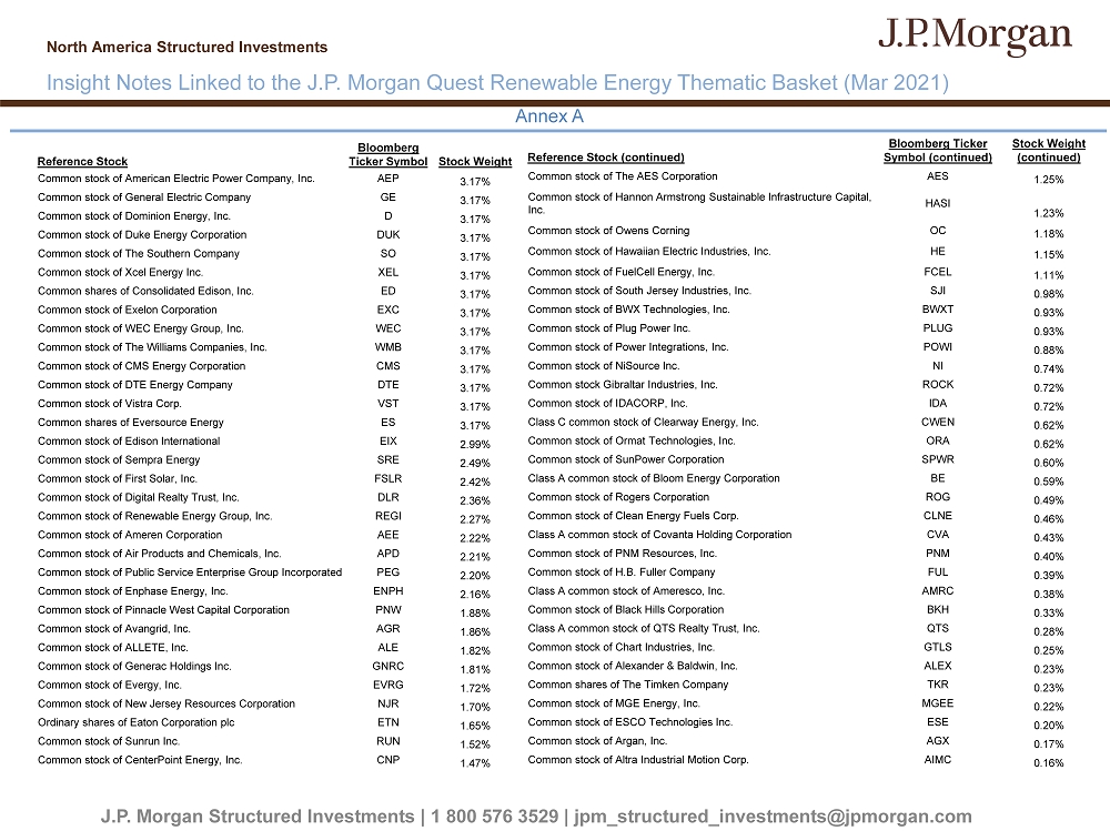 J.P. Morgan Structured Investments | 1 800 576 3529 | jpm_structured_investments@jpmorgan.com Annex A North America Structured Investments Insight Notes Linked to the J.P. Morgan Quest Renewable Energy Thematic Basket (Mar 2021) Reference Stock Bloomberg Ticker Symbol Stock Weight Common stock of American Electric Power Company, Inc . AEP 3.17% Common stock of General Electric Company GE 3.17% Common stock of Dominion Energy, Inc . D 3.17% Common stock of Duke Energy Corporation DUK 3.17% Common stock of The Southern Company SO 3.17% Common stock of Xcel Energy Inc . XEL 3.17% Common shares of Consolidated Edison, Inc . ED 3.17% Common stock of Exelon Corporation EXC 3.17% Common stock of WEC Energy Group, Inc . WEC 3.17% Common stock of The Williams Companies, Inc . WMB 3.17% Common stock of CMS Energy Corporation CMS 3.17% Common stock of DTE Energy Company DTE 3.17% Common stock of Vistra Corp . VST 3.17% Common shares of Eversource Energy ES 3.17% Common stock of Edison International EIX 2.99% Common stock of Sempra Energy SRE 2.49% Common stock of First Solar, Inc . FSLR 2.42% Common stock of Digital Realty Trust, Inc . DLR 2.36% Common stock of Renewable Energy Group, Inc . REGI 2.27% Common stock of Ameren Corporation AEE 2.22% Common stock of Air Products and Chemicals, Inc . APD 2.21% Common stock of Public Service Enterprise Group Incorporated PEG 2.20% Common stock of Enphase Energy, Inc . ENPH 2.16% Common stock of Pinnacle West Capital Corporation PNW 1.88% Common stock of Avangrid , Inc . AGR 1.86% Common stock of ALLETE, Inc . ALE 1.82% Common stock of Generac Holdings Inc . GNRC 1.81% Common stock of Evergy , Inc . EVRG 1.72% Common stock of New Jersey Resources Corporation NJR 1.70% Ordinary shares of Eaton Corporation plc ETN 1.65% Common stock of Sunrun Inc . RUN 1.52% Common stock of CenterPoint Energy, Inc . CNP 1.47% Reference Stock (continued) Bloomberg Ticker Symbol (continued) Stock Weight (continued) Common stock of The AES Corporation AES 1.25% Common stock of Hannon Armstrong Sustainable Infrastructure Capital, Inc . HASI 1.23% Common stock of Owens Corning OC 1.18% Common stock of Hawaiian Electric Industries, Inc . HE 1.15% Common stock of FuelCell Energy, Inc . FCEL 1.11% Common stock of South Jersey Industries, Inc . SJI 0.98% Common stock of BWX Technologies, Inc . BWXT 0.93% Common stock of Plug Power Inc . PLUG 0.93% Common stock of Power Integrations, Inc . POWI 0.88% Common stock of NiSource Inc . NI 0.74% Common stock Gibraltar Industries, Inc . ROCK 0.72% Common stock of IDACORP , Inc . IDA 0.72% Class C common stock of Clearway Energy, Inc . CWEN 0.62% Common stock of Ormat Technologies, Inc . ORA 0.62% Common stock of SunPower Corporation SPWR 0.60% Class A common stock of Bloom Energy Corporation BE 0.59% Common stock of Rogers Corporation ROG 0.49% Common stock of Clean Energy Fuels Corp . CLNE 0.46% Class A common stock of Covanta Holding Corporation CVA 0.43% Common stock of PNM Resources, Inc . PNM 0.40% Common stock of H.B . Fuller Company FUL 0.39% Class A common stock of Ameresco , Inc . AMRC 0.38% Common stock of Black Hills Corporation BKH 0.33% Class A common stock of QTS Realty Trust, Inc . QTS 0.28% Common stock of Chart Industries, Inc . GTLS 0.25% Common stock of Alexander & Baldwin, Inc . ALEX 0.23% Common shares of The Timken Company TKR 0.23% Common stock of MGE Energy, Inc . MGEE 0.22% Common stock of ESCO Technologies Inc . ESE 0.20% Common stock of Argan , Inc . AGX 0.17% Common stock of Altra Industrial Motion Corp . AIMC 0.16%