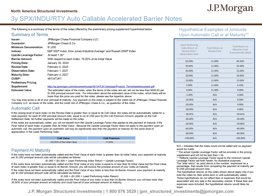 The following is a summary of the terms of the notes offered by the preliminary pricing supplement hyperlinked below. Summary of Terms Issuer: JPMorgan Chase Financial Company LLC Guarantor: JPMorgan Chase & Co. Minimum Denomination: $1,000 Indices: S&P 500 ® Index, Dow Jones Industrial Average ® and Russell 2000 ® Index Upside Leverage Factor: At least 1.30* Barrier Amount: With respect to each Index, 70.00% of its Initial Value Pricing Date: January 30 , 2024 Review Date: February 5, 2025 Observation Date: February 1, 2027 Maturity Date: February 4, 2027 CUSIP: 48134TJK1 Preliminary Pricing Supplement: http://sp.jpmorgan.com/document/cusip/48134TJK1/doctype/Product_Termsheet/document.pdf Estimated Value: The estimated value of the notes, when the terms of the notes are set, will not be less than $900.00 per $1,000 principal amount note. For information about the estimated value of the notes, which likely will be lower than the price you paid for the notes, please see the hyperlink above. You may lose some or all of your principal at maturity. Any payment on the notes is subject to the credit risk of JPMorgan Ch ase Financial Company LLC, as issuer of the notes, and the credit risk of JPMorgan Chase & Co., as guarantor of the notes. Automatic Call If the closing level of each Index on the Review Date is greater than or equal to its Call Value, the notes will be automatic all y called for a cash payment, for each $1,000 principal amount note, equal to (a) $1,000 plus (b) the Call Premium Amount, payable on the Call Settlement Date. No further payments will be made on the notes. If the notes are automatically called, you will not benefit from the Upside Leverage Factor that applies to the payment at ma tur ity if the Final Value of each Index is greater than its Initial Value. Because the Upside Leverage Factor does not apply to the paymen t u pon an automatic call, the payment upon an automatic call may be significantly less than the payment at maturity for the same level of appreciation in the Least Performing Index. Payment At Maturity If the notes have not been automatically called and the Final Value of each Index is greater than its Initial Value, your pay men t at maturity per $1,000 principal amount note will be calculated as follows: $1,000 + ($1,000 î Least Performing Index Return î Upside Leverage Factor) If the notes have not been automatically called and the Final Value of any Index is equal to or less than its Initial Value b ut the Final Value of each Index is greater than or equal to its Barrier Amount, you will receive the principal amount of your notes at maturity . If the notes have not been automatically called and the Final Value of any Index is less than its Barrier Amount, your paymen t a t maturity per $1,000 principal amount note will be calculated as follows: $1,000 + ($1,000 î Least Performing Index Return) If the notes have not been automatically called and the Final Value of any Index is less than its Barrier Amount, you will lo se more than 30.00% of your principal amount at maturity and could lose all of your principal amount at maturity. J.P. Morgan Structured Investments | 1 800 576 3529 | jpm_structured_investments@jpmorgan.com 3y SPX/ INDU / RTY Auto Callable Accelerated Barrier Notes North America Structured Investments Hypothetical Examples of Amounts Upon Automatic Call or at Maturity** Total Return at Maturity if not Automatically Called Total Return at Review Date Least Performing Index Return at Review Date / Observation Date 84.50% 11.00% 65.00% 65.00% 11.00% 50.00% 52.00% 11.00% 40.00% 26.00% 11.00% 20.00% 13.00% 11.00% 10.00% 6.50% 11.00% 5.00% 0.00% 11.00% 0.00% 0.00% N/A - 5.00% 0.00% N/A - 10.00% 0.00% N/A - 20.00% 0.00% N/A - 30.00% - 30.01% N/A - 30.01% - 40.00% N/A - 40.00% - 50.00% N/A - 50.00% - 60.00% N/A - 60.00% - 80.00% N/A - 80.00% - 100.00% N/A - 100.00% N/A – indicates that the notes would not be called and no payment would be made. * The actual Upside Leverage Factor will be provided in the pricing supplement and will not be less than 1.30. ** Reflects Upside Leverage Factor equal to the minimum Upside Leverage Factor set forth herein, for illustrative purposes. The “total return” as used above is the number, expressed as a percentage, that results from comparing the payment at maturity per $1,000 principal amount note. The hypothetical returns on the notes shown above apply only if you hold the notes for their entire term or until automatically called. These hypotheticals do not reflect fees or expenses that would be associated with any sale in the secondary market. If these fees and expenses were included, the hypothetical returns would likely be lower. Call Premium Call Value 11.00% 100.00% of the Initial Value