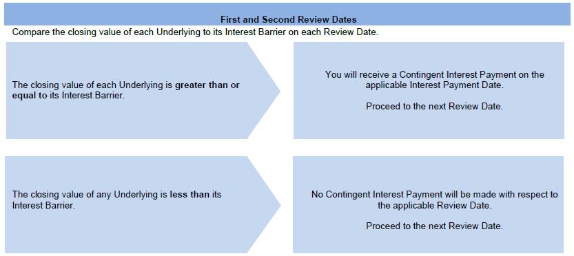 | ● | an Interest Barrier for the Least Performing Underlying of 70.00 (equal to 70.00% of its hypothetical Initial Value); |