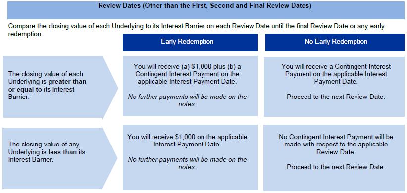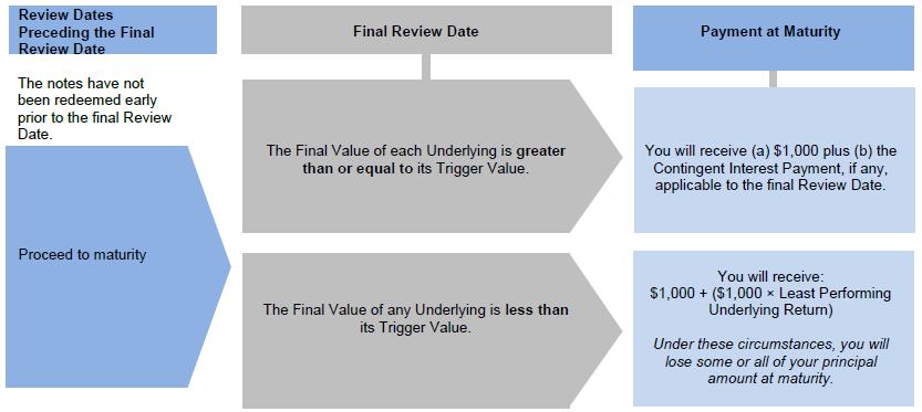 Early Redemption: We, at our election, may redeem the notes early, in whole but not in part, on any of the Interest Payment Dates (other than the first, second and final Interest Payment Dates) at a price, for each $1,000 principal amount note, equal to (a) $1,000 plus (b) the Contingent Interest Payment, if any, applicable to the immediately preceding Review Date. If we intend to redeem your notes early, we will deliver notice to The Depository Trust Company, or DTC, at least three business days before the applicable Interest Payment Date on which the notes are redeemed early. Payment at Maturity: If the notes have not been redeemed early and the Final Value of each Underlying is greater than or equal to its Trigger Value, you will receive a cash payment at maturity, for each $1,000 principal amount note, equal to (a) $1,000 plus (b) the Contingent Interest Payment, if any, applicable to the final Review Date. If the notes have not been redeemed early and the Final Value of any Underlying is less than its Trigger Value, your payment at maturity per $1,000 principal amount note will be calculated as follows: $1,000 + ($1,000 × Least Performing Underlying Return) If the notes have not been redeemed early and the Final Value of any Underlying is less than its Trigger Value, you will lose more than 40.00% of your principal amount at maturity and could lose all of your principal amount at maturity. Least Performing Underlying: The Underlying with the Least Performing Underlying Return Least Performing Underlying Return: The lowest of the Underlying Returns of the Underlyings Underlying Return: With respect to each Underlying, (Final