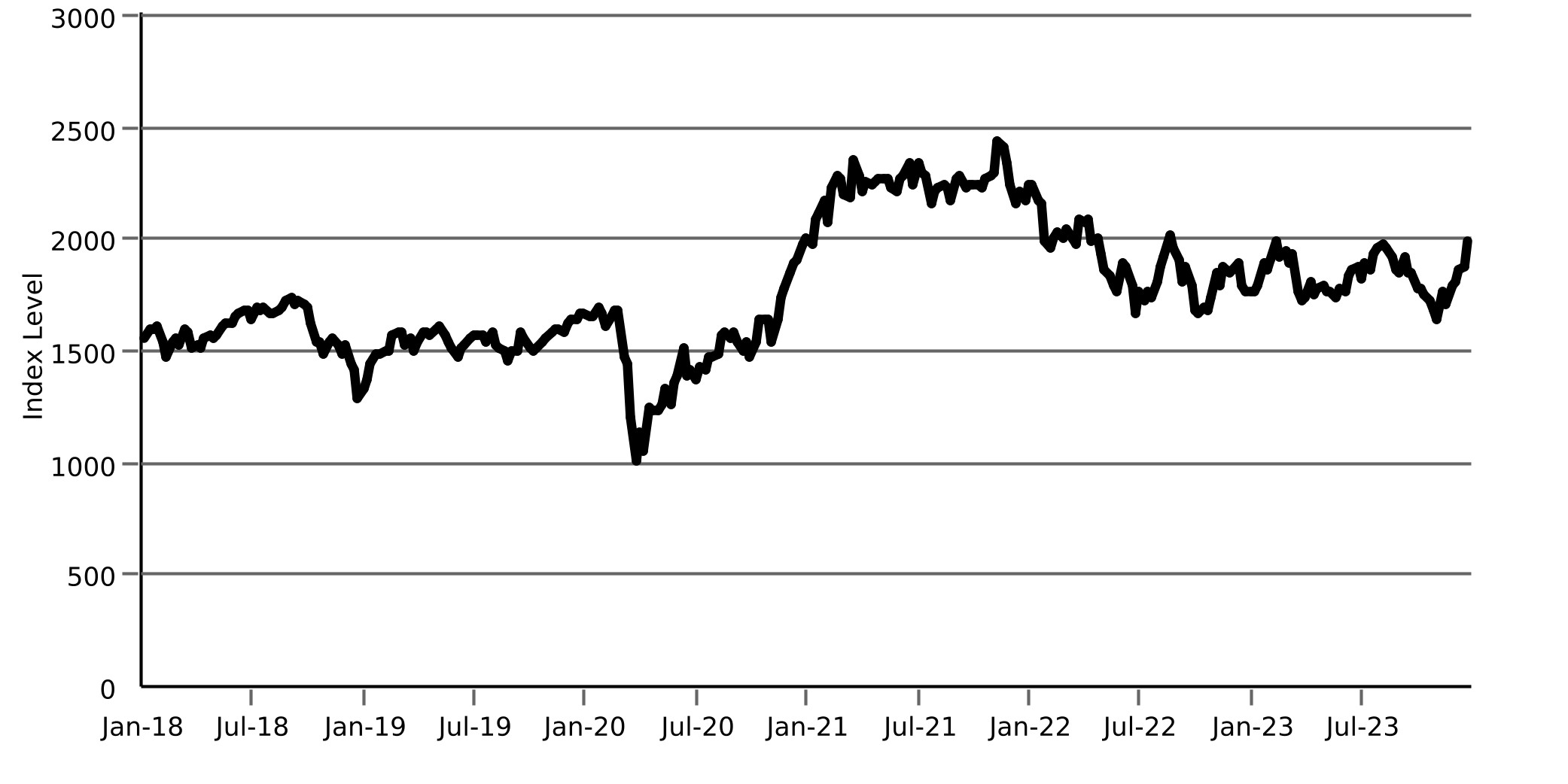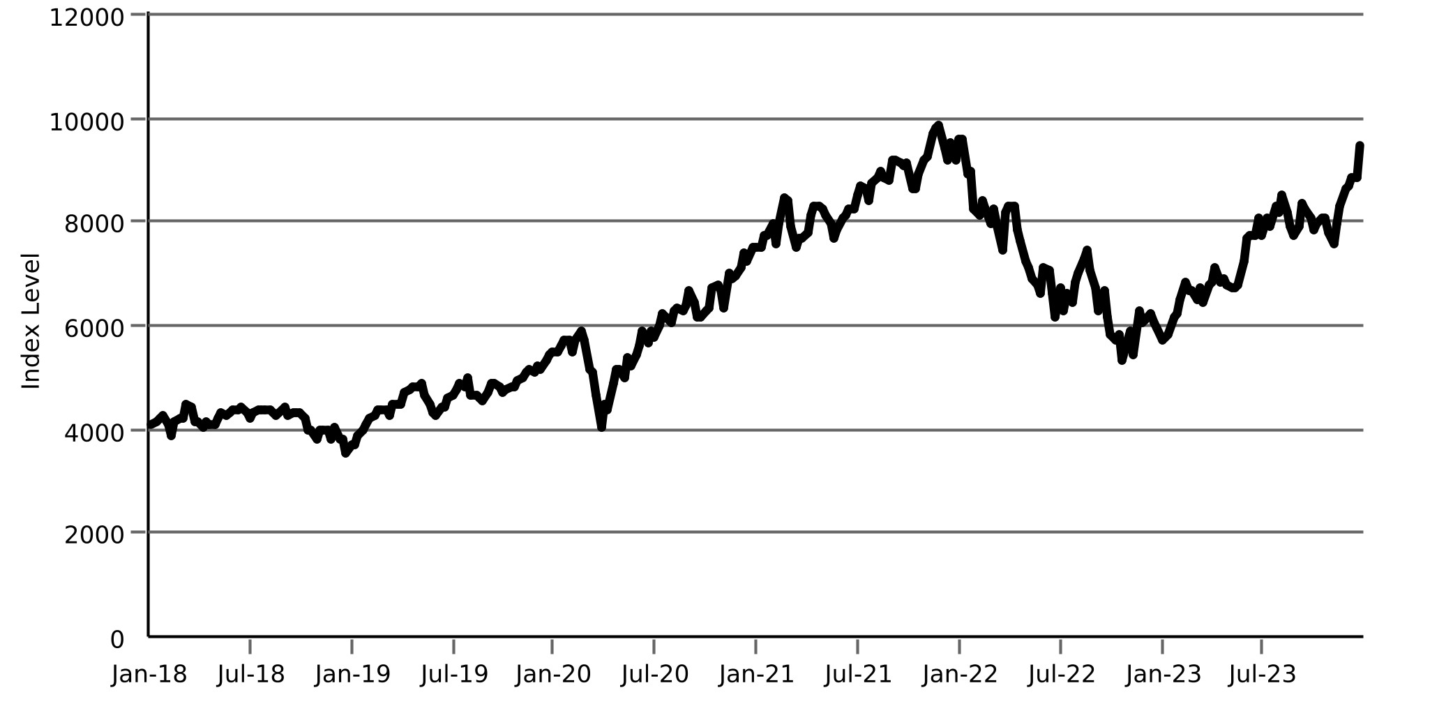 The following graphs set forth the historical performance of each Underlying based on the weekly historical closing values from January 5, 2018 through December 15, 2023. The closing value of the Nasdaq-100® Technology Sector IndexSM on December 21, 2023 was 9,523.19. The closing value of the Russell 2000® Index on December 21, 2023 was 2,017.065. The closing value of the SPDR® S&P® Regional Banking ETF on December 21, 2023 was $52.08. We obtained the closing values above and below from the Bloomberg Professional® service (“Bloomberg”), without independent verification. The closing values of the Fund above and below may have been adjusted by Bloomberg for actions taken by the Fund, such as stock splits.