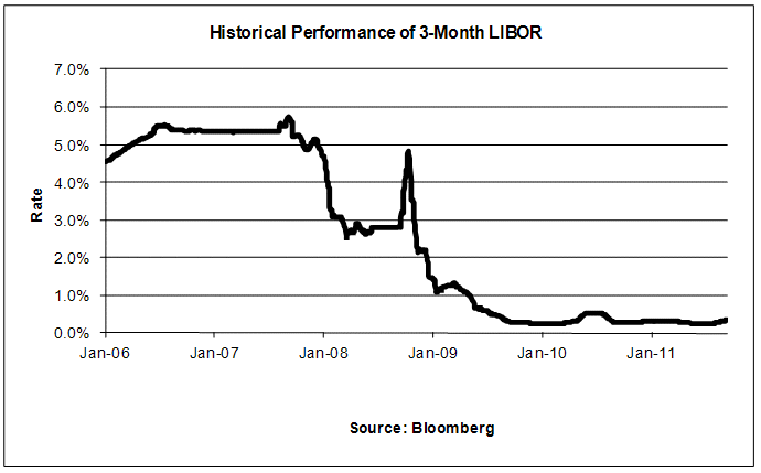The following graph sets forth the daily historical performance of 3-Month USD LIBOR from January 3, 2006 through December 1, 2011. We obtained the rates used to construct the graph below from Bloomberg Financial Markets. We make no representation or warranty as to the accuracy or completeness of the information obtained from Bloomberg Financial Markets.
