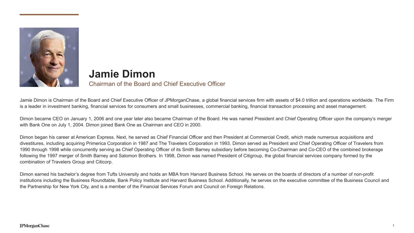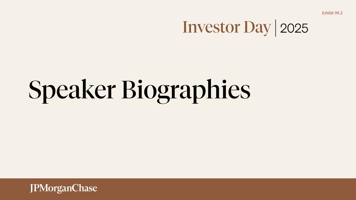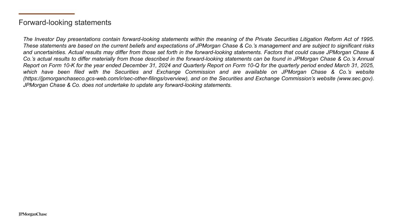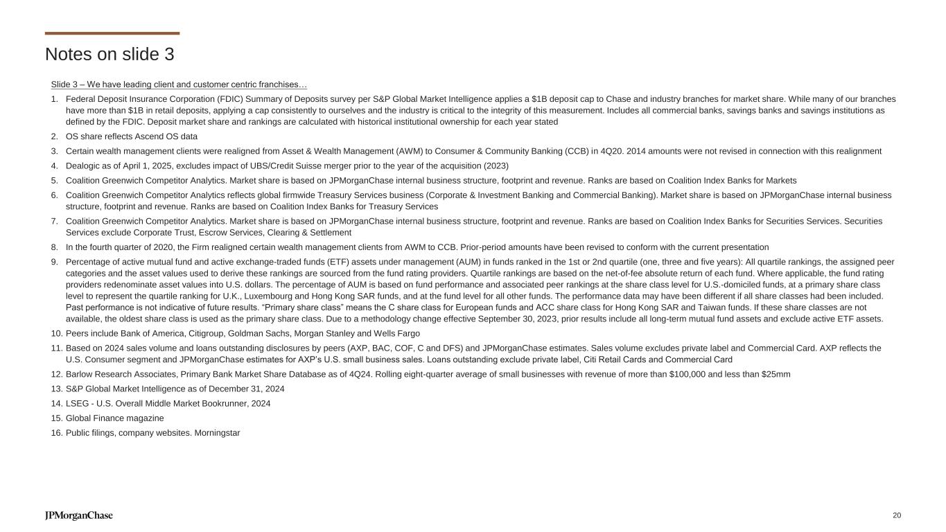 Notes on slide 3 Slide 3 – We have leading client and customer centric franchises… 1. Federal Deposit Insurance Corporation (FDIC) Summary of Deposits survey per S&P Global Market Intelligence applies a $1B deposit cap to Chase and industry branches for market share. While many of our branches have more than $1B in retail deposits, applying a cap consistently to ourselves and the industry is critical to the integrity of this measurement. Includes all commercial banks, savings banks and savings institutions as defined by the FDIC. Deposit market share and rankings are calculated with historical institutional ownership for each year stated 2. OS share reflects Ascend OS data 3. Certain wealth management clients were realigned from Asset & Wealth Management (AWM) to Consumer & Community Banking (CCB) in 4Q20. 2014 amounts were not revised in connection with this realignment 4. Dealogic as of April 1, 2025, excludes impact of UBS/Credit Suisse merger prior to the year of the acquisition (2023) 5. Coalition Greenwich Competitor Analytics. Market share is based on JPMorganChase internal business structure, footprint and revenue. Ranks are based on Coalition Index Banks for Markets 6. Coalition Greenwich Competitor Analytics reflects global firmwide Treasury Services business (Corporate & Investment Banking and Commercial Banking). Market share is based on JPMorganChase internal business structure, footprint and revenue. Ranks are based on Coalition Index Banks for Treasury Services 7. Coalition Greenwich Competitor Analytics. Market share is based on JPMorganChase internal business structure, footprint and revenue. Ranks are based on Coalition Index Banks for Securities Services. Securities Services exclude Corporate Trust, Escrow Services, Clearing & Settlement 8. In the fourth quarter of 2020, the Firm realigned certain wealth management clients from AWM to CCB. Prior-period amounts have been revised to conform with the current presentation 9. Percentage of active mutual fund and active exchange-traded funds (ETF) assets under management (AUM) in funds ranked in the 1st or 2nd quartile (one, three and five years): All quartile rankings, the assigned peer categories and the asset values used to derive these rankings are sourced from the fund rating providers. Quartile rankings are based on the net-of-fee absolute return of each fund. Where applicable, the fund rating providers redenominate asset values into U.S. dollars. The percentage of AUM is based on fund performance and associated peer rankings at the share class level for U.S.-domiciled funds, at a primary share class level to represent the quartile ranking for U.K., Luxembourg and Hong Kong SAR funds, and at the fund level for all other funds. The performance data may have been different if all share classes had been included. Past performance is not indicative of future results. “Primary share class” means the C share class for European funds and ACC share class for Hong Kong SAR and Taiwan funds. If these share classes are not available, the oldest share class is used as the primary share class. Due to a methodology change effective September 30, 2023, prior results include all long-term mutual fund assets and exclude active ETF assets. 10. Peers include Bank of America, Citigroup, Goldman Sachs, Morgan Stanley and Wells Fargo 11. Based on 2024 sales volume and loans outstanding disclosures by peers (AXP, BAC, COF, C and DFS) and JPMorganChase estimates. Sales volume excludes private label and Commercial Card. AXP reflects the U.S. Consumer segment and JPMorganChase estimates for AXP’s U.S. small business sales. Loans outstanding exclude private label, Citi Retail Cards and Commercial Card 12. Barlow Research Associates, Primary Bank Market Share Database as of 4Q24. Rolling eight-quarter average of small businesses with revenue of more than $100,000 and less than $25mm 13. S&P Global Market Intelligence as of December 31, 2024 14. LSEG - U.S. Overall Middle Market Bookrunner, 2024 15. Global Finance magazine 16. Public filings, company websites. Morningstar 20