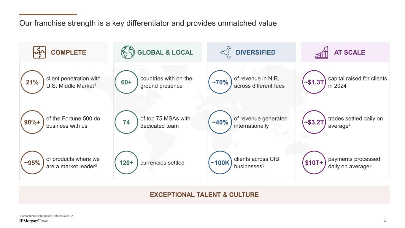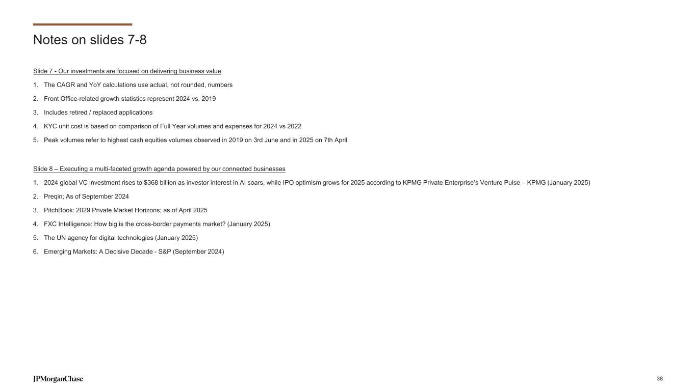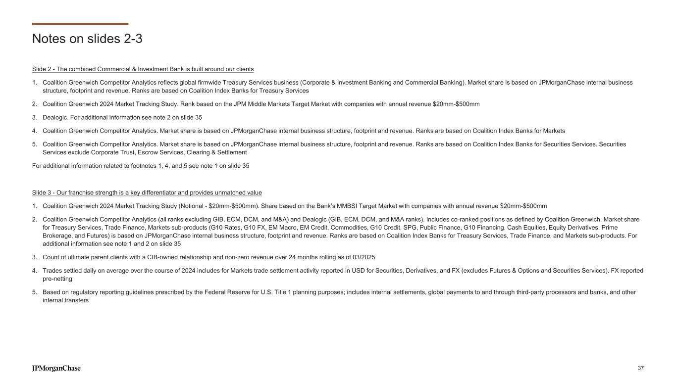 Notes on slides 2-3 Slide 2 - The combined Commercial & Investment Bank is built around our clients 1. Coalition Greenwich Competitor Analytics reflects global firmwide Treasury Services business (Corporate & Investment Banking and Commercial Banking). Market share is based on JPMorganChase internal business structure, footprint and revenue. Ranks are based on Coalition Index Banks for Treasury Services 2. Coalition Greenwich 2024 Market Tracking Study. Rank based on the JPM Middle Markets Target Market with companies with annual revenue $20mm-$500mm 3. Dealogic. For additional information see note 2 on slide 35 4. Coalition Greenwich Competitor Analytics. Market share is based on JPMorganChase internal business structure, footprint and revenue. Ranks are based on Coalition Index Banks for Markets 5. Coalition Greenwich Competitor Analytics. Market share is based on JPMorganChase internal business structure, footprint and revenue. Ranks are based on Coalition Index Banks for Securities Services. Securities Services exclude Corporate Trust, Escrow Services, Clearing & Settlement For additional information related to footnotes 1, 4, and 5 see note 1 on slide 35 Slide 3 - Our franchise strength is a key differentiator and provides unmatched value 1. Coalition Greenwich 2024 Market Tracking Study (Notional - $20mm-$500mm). Share based on the Bank’s MMBSI Target Market with companies with annual revenue $20mm-$500mm 2. Coalition Greenwich Competitor Analytics (all ranks excluding GIB, ECM, DCM, and M&A) and Dealogic (GIB, ECM, DCM, and M&A ranks). Includes co-ranked positions as defined by Coalition Greenwich. Market share for Treasury Services, Trade Finance, Markets sub-products (G10 Rates, G10 FX, EM Macro, EM Credit, Commodities, G10 Credit, SPG, Public Finance, G10 Financing, Cash Equities, Equity Derivatives, Prime Brokerage, and Futures) is based on JPMorganChase internal business structure, footprint and revenue. Ranks are based on Coalition Index Banks for Treasury Services, Trade Finance, and Markets sub-products. For additional information see note 1 and 2 on slide 35 3. Count of ultimate parent clients with a CIB-owned relationship and non-zero revenue over 24 months rolling as of 03/2025 4. Trades settled daily on average over the course of 2024 includes for Markets trade settlement activity reported in USD for Securities, Derivatives, and FX (excludes Futures & Options and Securities Services). FX reported pre-netting 5. Based on regulatory reporting guidelines prescribed by the Federal Reserve for U.S. Title 1 planning purposes; includes internal settlements, global payments to and through third-party processors and banks, and other internal transfers 37
