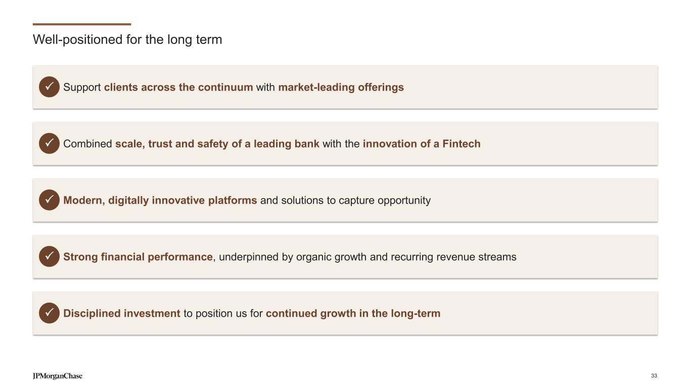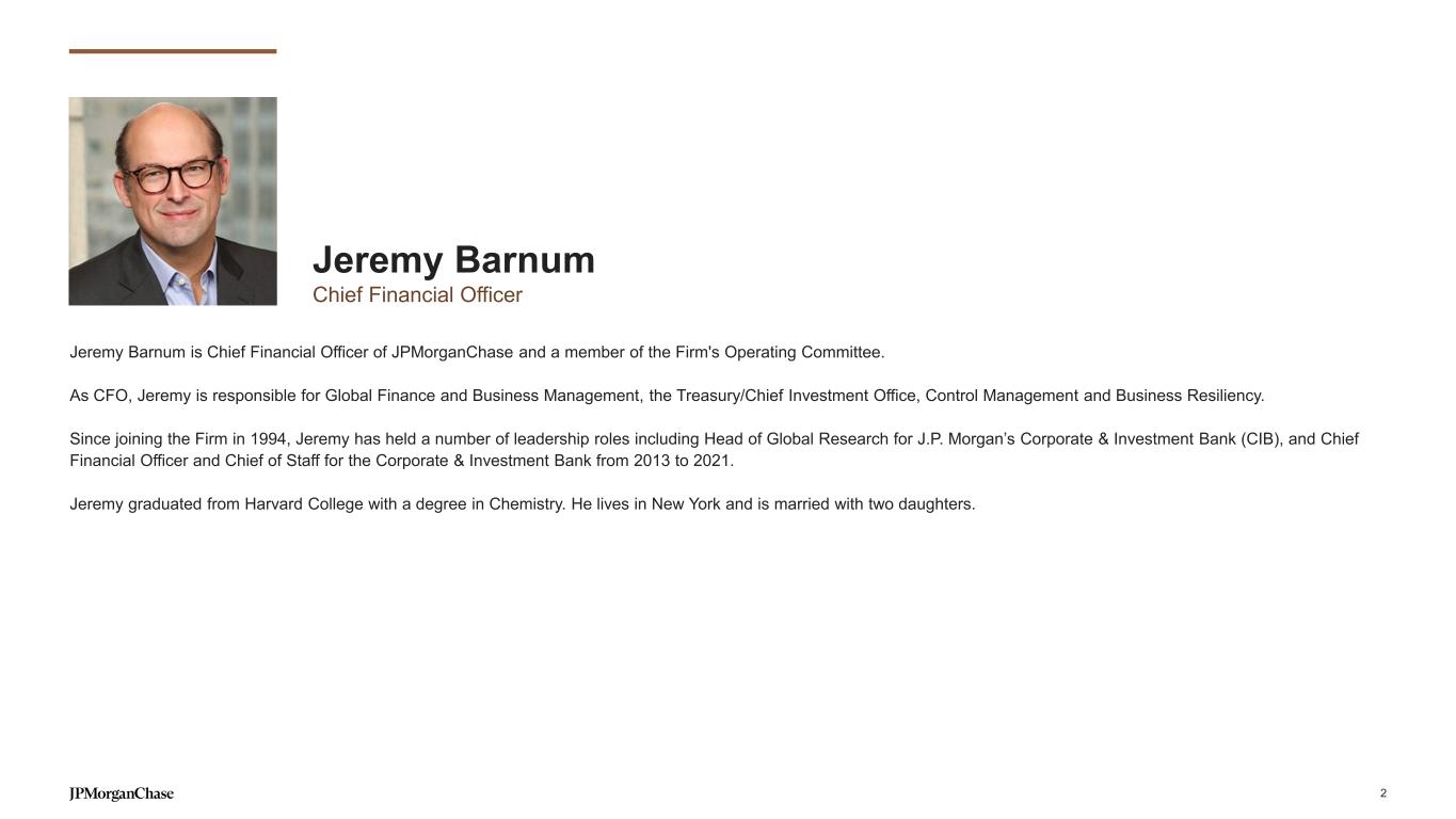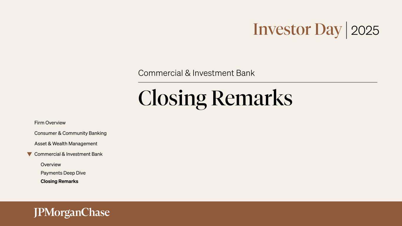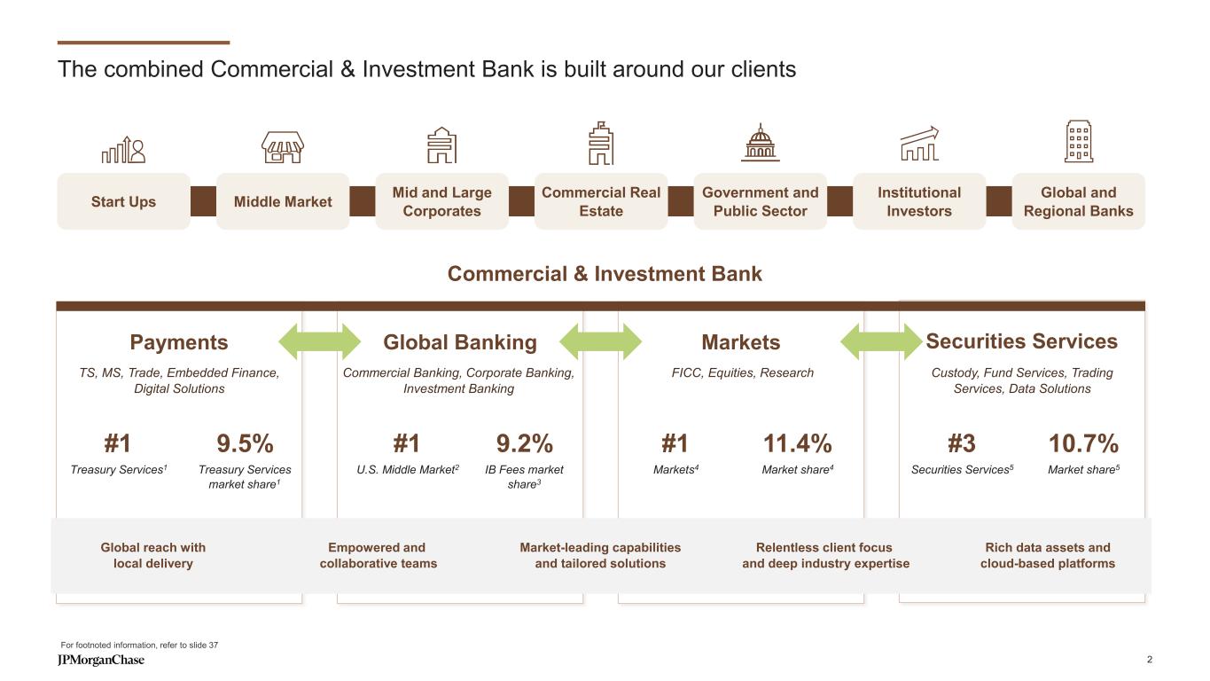 Notes on slides 2-3 Slide 2 - The combined Commercial & Investment Bank is built around our clients 1. Coalition Greenwich Competitor Analytics reflects global firmwide Treasury Services business (Corporate & Investment Banking and Commercial Banking). Market share is based on JPMorganChase internal business structure, footprint and revenue. Ranks are based on Coalition Index Banks for Treasury Services 2. Coalition Greenwich 2024 Market Tracking Study. Rank based on the JPM Middle Markets Target Market with companies with annual revenue $20mm-$500mm 3. Dealogic. For additional information see note 2 on slide 35 4. Coalition Greenwich Competitor Analytics. Market share is based on JPMorganChase internal business structure, footprint and revenue. Ranks are based on Coalition Index Banks for Markets 5. Coalition Greenwich Competitor Analytics. Market share is based on JPMorganChase internal business structure, footprint and revenue. Ranks are based on Coalition Index Banks for Securities Services. Securities Services exclude Corporate Trust, Escrow Services, Clearing & Settlement For additional information related to footnotes 1, 4, and 5 see note 1 on slide 35 Slide 3 - Our franchise strength is a key differentiator and provides unmatched value 1. Coalition Greenwich 2024 Market Tracking Study (Notional - $20mm-$500mm). Share based on the Bank’s MMBSI Target Market with companies with annual revenue $20mm-$500mm 2. Coalition Greenwich Competitor Analytics (all ranks excluding GIB, ECM, DCM, and M&A) and Dealogic (GIB, ECM, DCM, and M&A ranks). Includes co-ranked positions as defined by Coalition Greenwich. Market share for Treasury Services, Trade Finance, Markets sub-products (G10 Rates, G10 FX, EM Macro, EM Credit, Commodities, G10 Credit, SPG, Public Finance, G10 Financing, Cash Equities, Equity Derivatives, Prime Brokerage, and Futures) is based on JPMorganChase internal business structure, footprint and revenue. Ranks are based on Coalition Index Banks for Treasury Services, Trade Finance, and Markets sub-products. For additional information see note 1 and 2 on slide 35 3. Count of ultimate parent clients with a CIB-owned relationship and non-zero revenue over 24 months rolling as of 03/2025 4. Trades settled daily on average over the course of 2024 includes for Markets trade settlement activity reported in USD for Securities, Derivatives, and FX (excludes Futures & Options and Securities Services). FX reported pre-netting 5. Based on regulatory reporting guidelines prescribed by the Federal Reserve for U.S. Title 1 planning purposes; includes internal settlements, global payments to and through third-party processors and banks, and other internal transfers 37