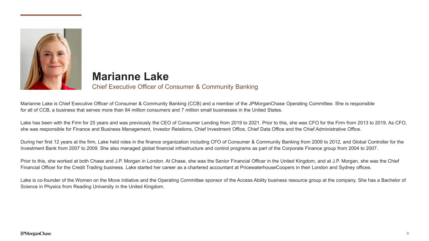 The combined Commercial & Investment Bank is built around our clients Commercial & Investment Bank Global Banking Commercial Banking, Corporate Banking, Investment Banking Markets FICC, Equities, Research Payments Securities Services Custody, Fund Services, Trading Services, Data Solutions Middle MarketStart Ups Mid and Large Corporates Government and Public Sector Institutional Investors Global and Regional Banks Commercial Real Estate TS, MS, Trade, Embedded Finance, Digital Solutions #1 Markets4 11.4% Market share4 #3 Securities Services5 10.7% Market share5 #1 Treasury Services1 9.5% Treasury Services market share1 #1 U.S. Middle Market2 9.2% IB Fees market share3 For footnoted information, refer to slide 37 Global reach with local delivery Empowered and collaborative teams Rich data assets and cloud-based platforms Market-leading capabilities and tailored solutions Relentless client focus and deep industry expertise 2