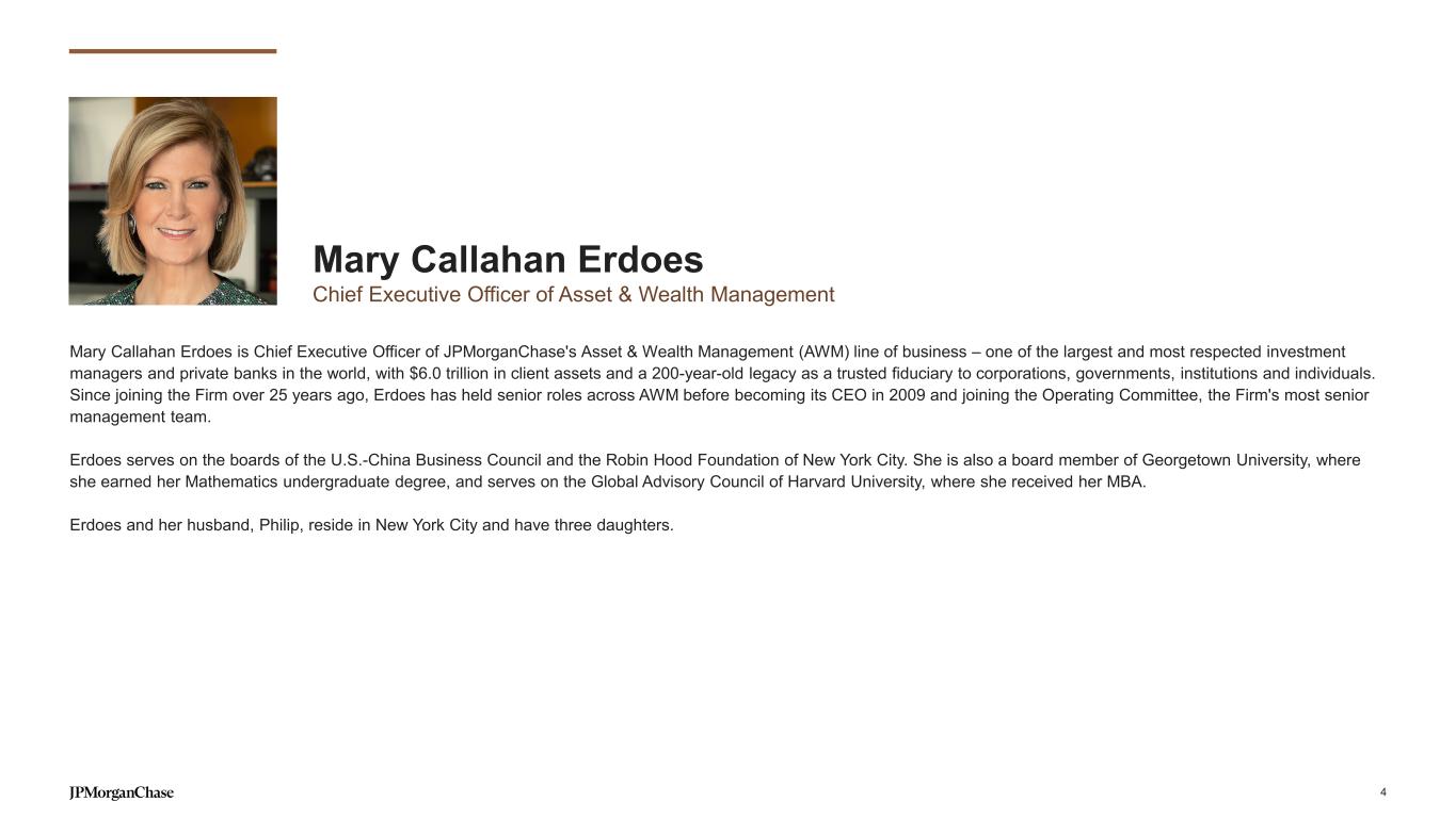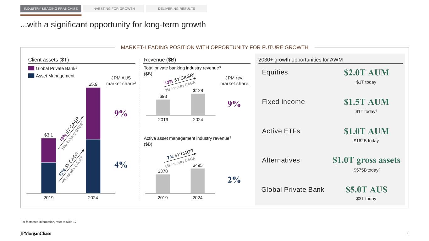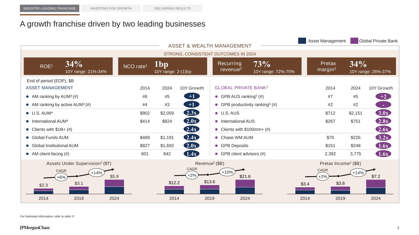 STRONG, CONSISTENT OUTCOMES IN 2024 Pretax Income2 ($B)Assets Under Supervision2 ($T) Revenue2 ($B) Global Private BankAsset Management 2014 2019 2024 $3.4 $3.8 $7.2+2% +14% 2014 2019 2024 $2.3 $3.1 $5.9+6% +14% INDUSTRY-LEADING FRANCHISE INVESTING FOR GROWTH DELIVERING RESULTS CAGR A growth franchise driven by two leading businesses 2014 2019 2024 $12.2 $13.6 $21.6+2% +10% 2014 2024 10Y Growth ⚫ AM ranking by AUM3 (#) ⚫ AM ranking by active AUM3 (#) #6 #4 #5 #3 ⚫ U.S. AUM4 ⚫ International AUM4 ⚫ Clients with $1B+ (#) ⚫ Global Funds AUM ⚫ Global Institutional AUM ⚫ AM client-facing (#) $902 $414 $489 $827 601 $2,059 $824 $1,191 $1,692 842 ASSET MANAGEMENT +1 +1 2014 2024 10Y Growth ⚫ GPB AUS ranking5 (#) ⚫ GPB productivity ranking6 (#) #7 #2 #5 #2 ⚫ U.S. AUS ⚫ International AUS ⚫ Clients with $100mm+ (#) ⚫ Chase WM AUM ⚫ GPB Deposits ⚫ GPB client advisors (#) $712 $267 $70 $151 2,392 $2,151 $751 $226 $248 3,775 +2 - GLOBAL PRIVATE BANK2 End of period (EOP), $B CAGR CAGR 2.3x 2.4x 2.4x 2.0x 1.4x 2.0x 3.0x 2.8x 2.6x 1.6x 3.2x 1.6x 73% 10Y range: 72%-75% Recurring revenue2NCO rate1 1bp 10Y range: 2-(1)bp For footnoted information, refer to slide 17 34% 10Y range: 21%-34% ROE1 34% 10Y range: 26%-37% Pretax margin2 ASSET & WEALTH MANAGEMENT 3