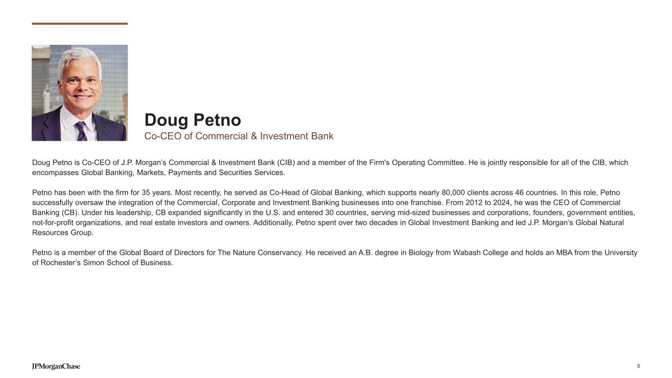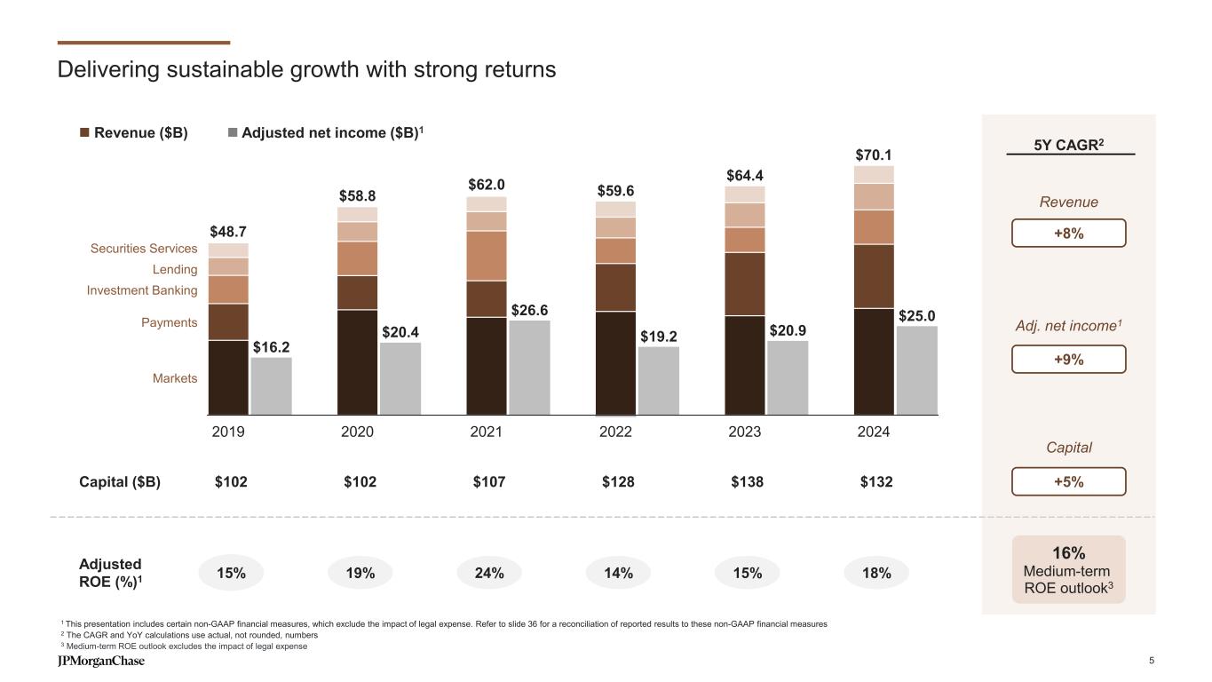 Increased strategic momentum over the last 5 years 3% CAGR Total Customers1 (91mm, +3% YoY) 7% CAGR Multi-LOB Customers2 (26mm, +7% YoY) 6% CAGR Digital Active Customers3 (71mm, +6% YoY) 2% CAGR Branch Active Customers4 (41mm, +4% YoY) Record high Net Promoter Score5 (~65, +5pts) Record high Branch and Digital CSAT5 (>5pt gains in each) INVESTING TO DRIVE GROWTH, PRODUCTIVITY AND POSITION FOR THE FUTURE Best-in-class financial performance with >25% ROE on a reported and normalized basis16 GROWING, ENGAGING AND DEEPENING CUSTOMER RELATIONSHIPS EXTENDING OUR LEADERSHIP AND SCALING GROWTH BUSINESSES6 Growth Engagement Experience Industry-leading businesses Growth businesses +220bps Retail Deposit Share7 (11.3%, -10bps YoY) +30bps BB Primary Share8 (9.7% +20bps YoY) +90bps Card OS Share10 (17.3%, +60bps YoY) 2x vs. 2021 Commerce Volumes12 ($23B, +19% YoY) 2x Client Investment Assets11 ($1.1T, +14% YoY) >30% Reduction in critical tech incidents +35% Increase in value from AI / ML15 Tech, Data & AI +25% Customers per branch13 >25% Accounts per Ops FTE14 Productivity >2x Return on marketing investments <5yr Payback on strategic product & tech investments Returns on investments <4 yr Break-even on branches, bankers and advisors (2019-2024) (2019-2024) (2024) (vs. 2019) +110bps Card Sales Share9 (23.5%, +60bps YoY) (YoY) For footnoted information, refer to slide 48 4