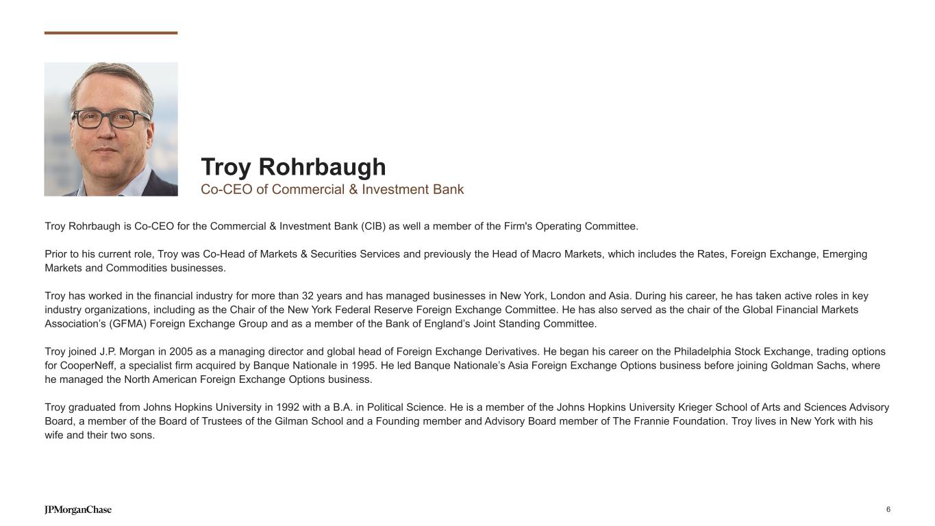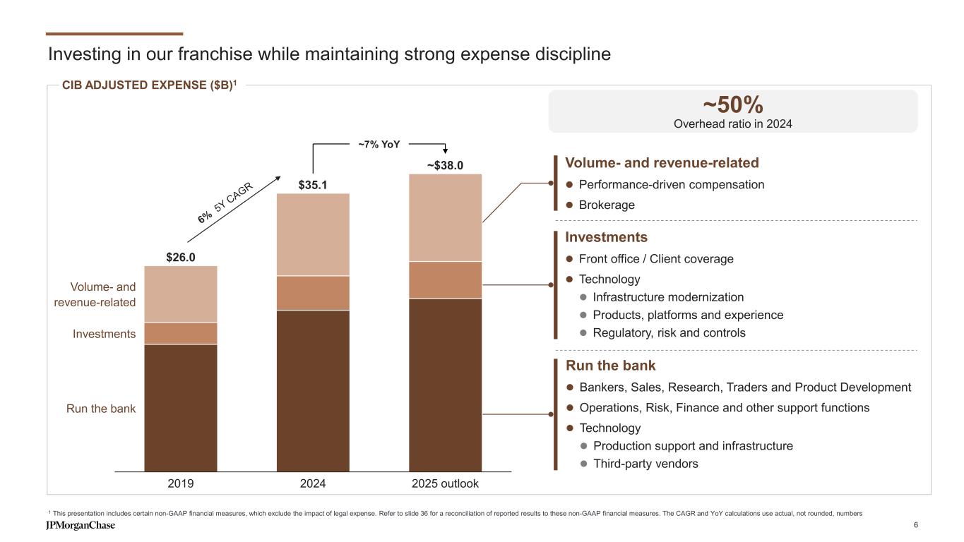 Delivering sustainable growth with strong returns Adjusted net income ($B)1 Adjusted ROE (%)1 $102 $102 $107 $128 $138Capital ($B) Revenue ($B) 15% 19% 24% 14% 15% $132 18% 5Y CAGR2 Revenue +8% Adj. net income1 +9% Capital +5% 16% Medium-term ROE outlook3 2019 2020 2021 2022 2023 2024 Securities Services Lending Investment Banking Payments Markets $48.7 $16.2 $58.8 $20.4 $62.0 $26.6 $59.6 $19.2 $64.4 $20.9 $70.1 $25.0 5 1 This presentation includes certain non-GAAP financial measures, which exclude the impact of legal expense. Refer to slide 36 for a reconciliation of reported results to these non-GAAP financial measures 2 The CAGR and YoY calculations use actual, not rounded, numbers 3 Medium-term ROE outlook excludes the impact of legal expense