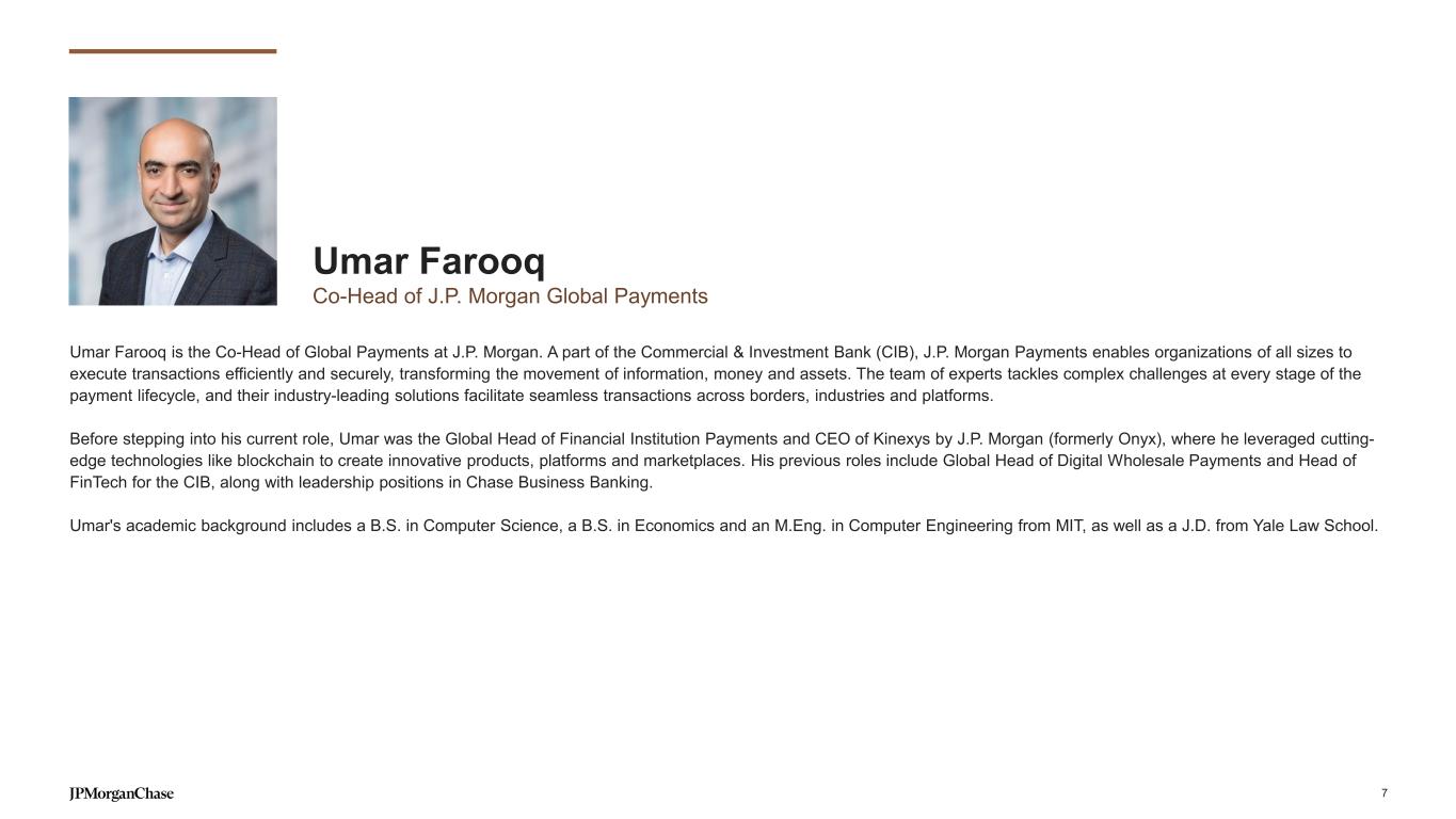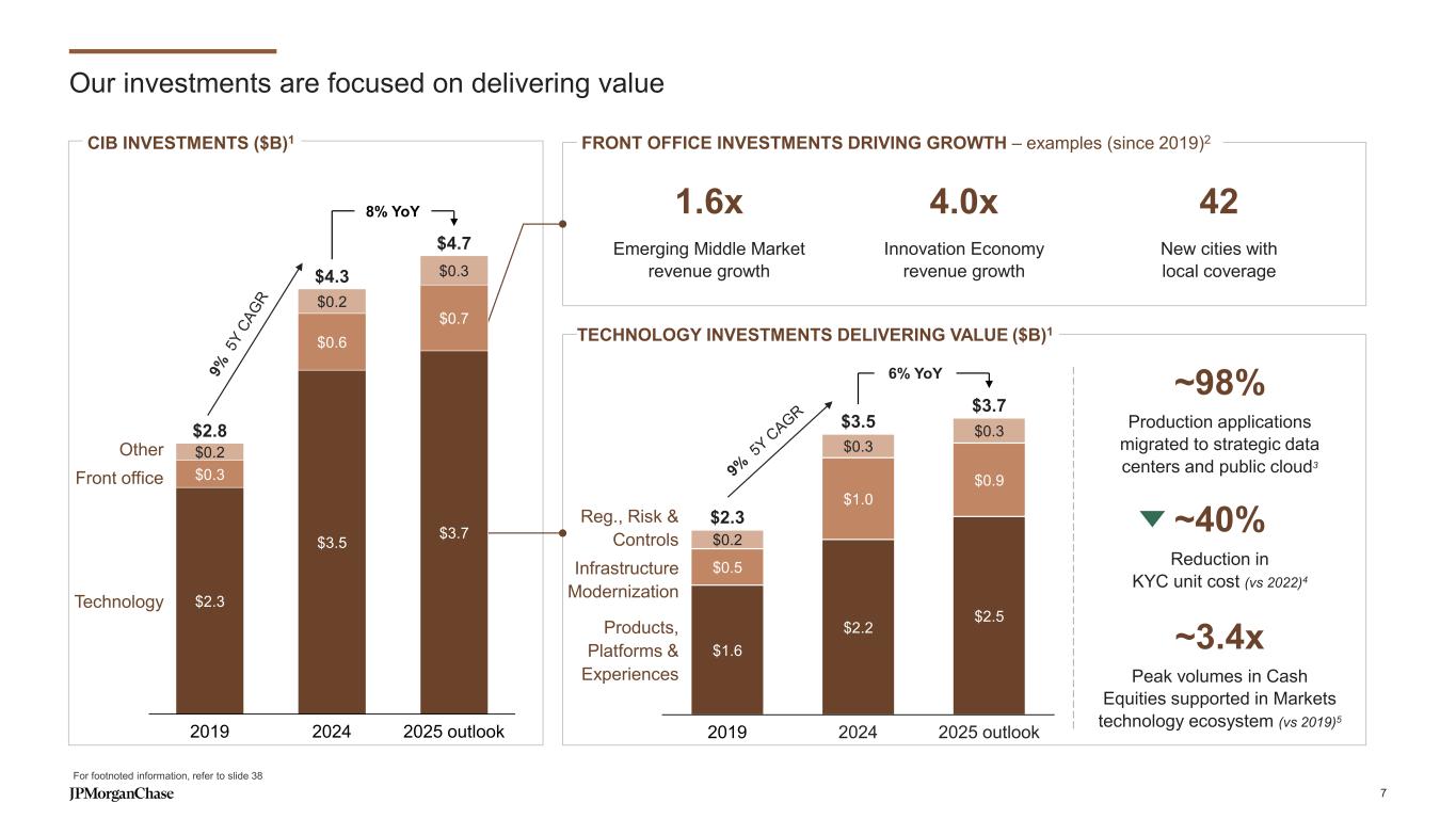 Investing in our franchise while maintaining strong expense discipline CIB ADJUSTED EXPENSE ($B)1 2019 2024 2025 outlook Run the bank Investments Volume- and revenue-related $26.0 $35.1 ~$38.0 ~7% YoY ~50% Overhead ratio in 2024 6 Volume- and revenue-related Performance-driven compensation Brokerage Investments Front office / Client coverage Technology Infrastructure modernization Products, platforms and experience Regulatory, risk and controls Run the bank Bankers, Sales, Research, Traders and Product Development Operations, Risk, Finance and other support functions Technology Production support and infrastructure Third-party vendors 1 This presentation includes certain non-GAAP financial measures, which exclude the impact of legal expense. Refer to slide 36 for a reconciliation of reported results to these non-GAAP financial measures. The CAGR and YoY calculations use actual, not rounded, numbers