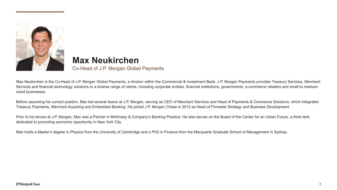 Our investments are focused on delivering value 2019 2024 2025 outlook Reg., Risk & Controls Infrastructure Modernization Products, Platforms & Experiences $2.3 $3.5 $3.7 $0.2 $0.3 $0.3 $0.5 $1.0 $0.9 $1.6 $2.2 $2.5 Emerging Middle Market revenue growth 1.6x Innovation Economy revenue growth 4.0x New cities with local coverage 42 Production applications migrated to strategic data centers and public cloud3 ~98% Reduction in KYC unit cost (vs 2022)4 ~40% Peak volumes in Cash Equities supported in Markets technology ecosystem (vs 2019)5 ~3.4x 2019 2024 $0.3 2025 outlook Technology Front office Other $2.8 $4.3 $4.7 $0.2 $0.3 $2.3 $0.2 $0.6 $3.5 $0.7 $3.7 8% YoY 6% YoY CIB INVESTMENTS ($B)1 FRONT OFFICE INVESTMENTS DRIVING GROWTH – examples (since 2019)2 TECHNOLOGY INVESTMENTS DELIVERING VALUE ($B)1 For footnoted information, refer to slide 38 7