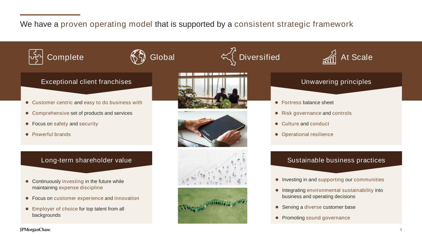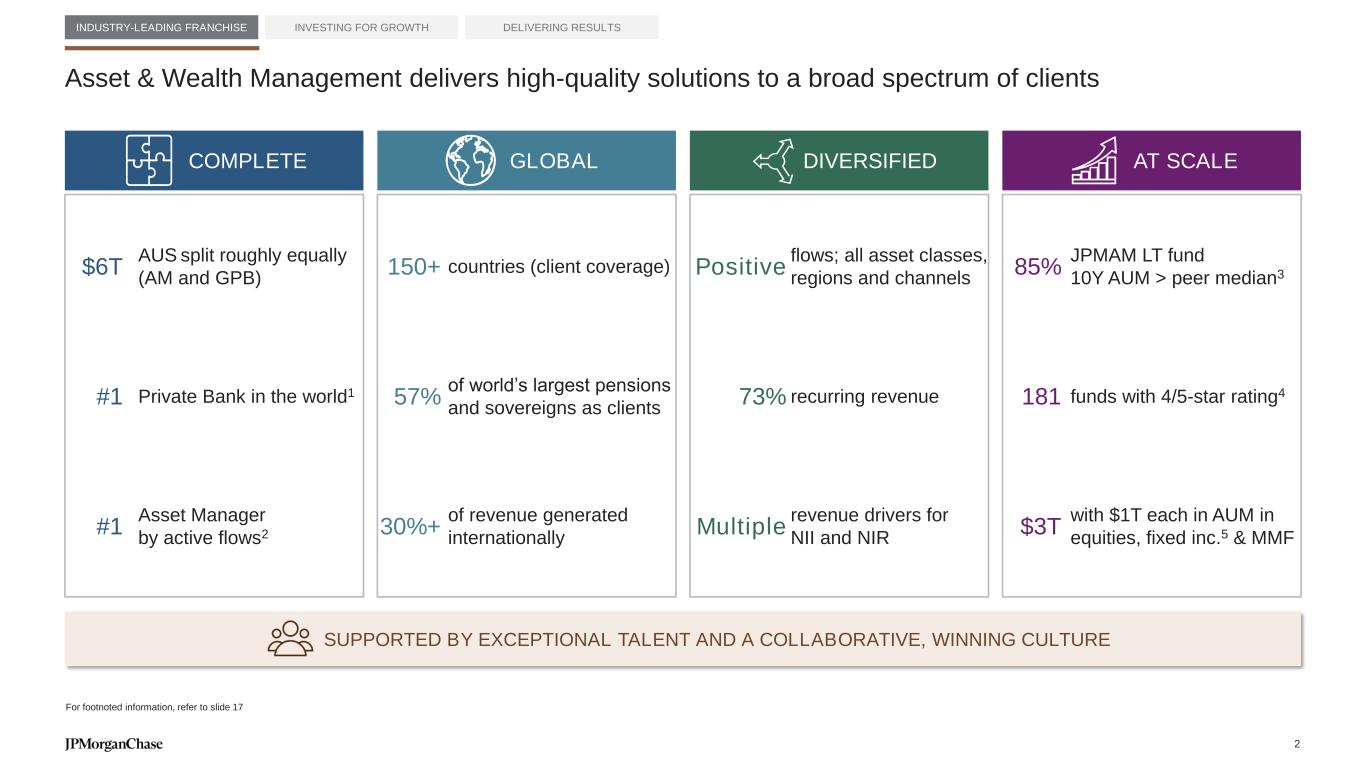 Complete Global Diversified At Scale We have a proven operating model that is supported by a consistent strategic framework ⚫ Continuously investing in the future while maintaining expense discipline ⚫ Focus on customer experience and innovation ⚫ Employer of choice for top talent from all backgrounds Long-term shareholder value ⚫ Customer centric and easy to do business with ⚫ Comprehensive set of products and services ⚫ Focus on safety and security ⚫ Powerful brands ⚫ Fortress balance sheet ⚫ Risk governance and controls ⚫ Culture and conduct ⚫ Operational resilience Unwavering principles ⚫ Investing in and supporting our communities ⚫ Integrating environmental sustainability into business and operating decisions ⚫ Serving a diverse customer base ⚫ Promoting sound governance Sustainable business practices Exceptional client franchises 1