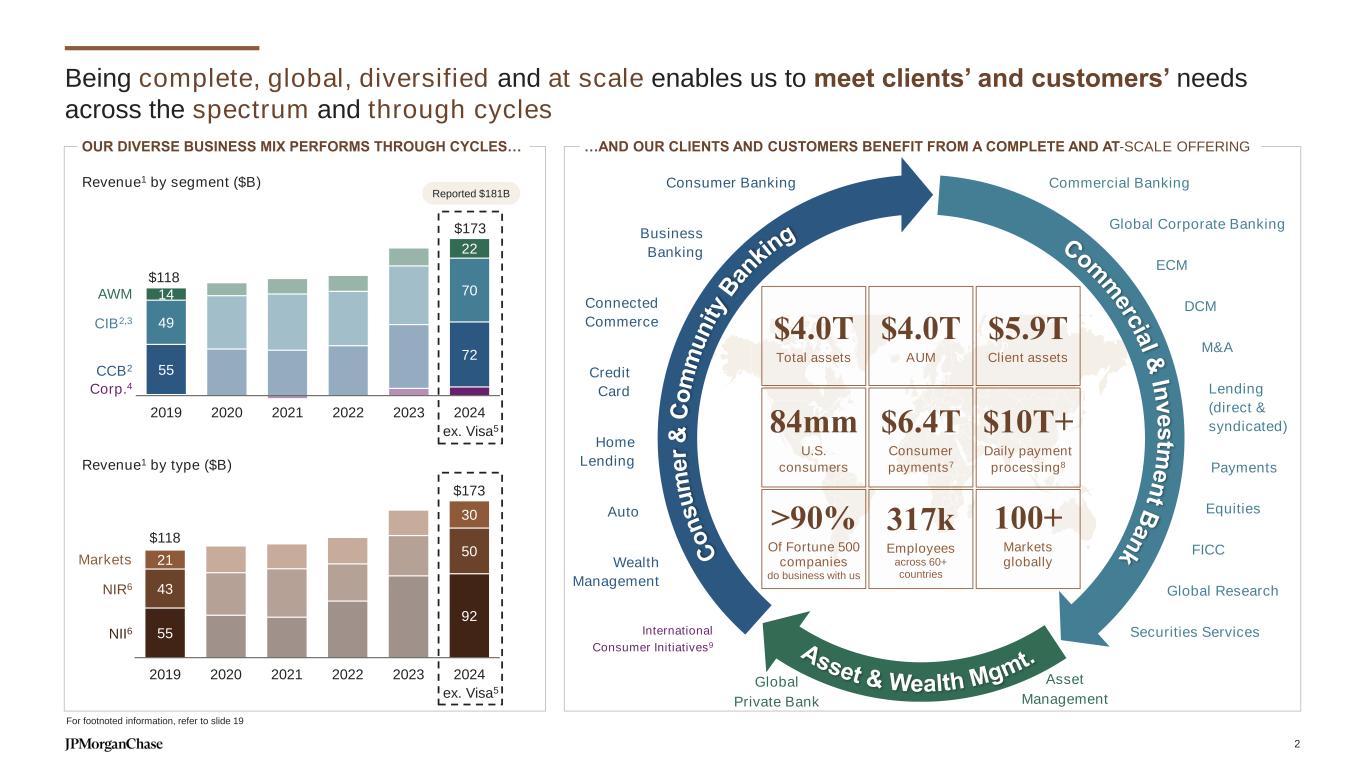 C o n s u m e r & C o m m u n it y B an ki ng Asset & Wealth Mgmt. Com m erc ia l & In v e s tm e n t B a n k $118 $173 55 72 49 7014 22 2019 2020 2021 2022 2023 2024 Being complete, global, diversified and at scale enables us to meet clients’ and customers’ needs across the spectrum and through cycles CCB2 CIB2,3 AWM Corp.4 Revenue1 by segment ($B) OUR DIVERSE BUSINESS MIX PERFORMS THROUGH CYCLES… 55 92 43 50 21 30 $118 $173 2019 2020 2021 2022 2023 2024 NII6 NIR6 Markets Revenue1 by type ($B) Fill level Global Corporate Banking DCM Lending (direct & syndicated) Payments M&A FICC Equities Global Research Commercial Banking ECM Business Banking International Consumer Initiatives9 Consumer Banking Wealth Management Home Lending Auto Asset Management Securities Services Global Private Bank $4.0T Total assets $4.0T AUM 84mm U.S. consumers $5.9T Client assets 317k Employees across 60+ countries >90% Of Fortune 500 companies do business with us $6.4T Consumer payments7 $10T+ Daily payment processing8 100+ Markets globally Connected Commerce …AND OUR CLIENTS AND CUSTOMERS BENEFIT FROM A COMPLETE AND AT-SCALE OFFERING ex. Visa5 Reported $181B ex. Visa5 For footnoted information, refer to slide 19 Credit Card 2