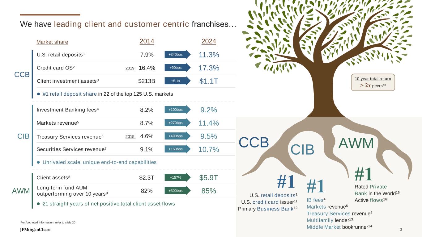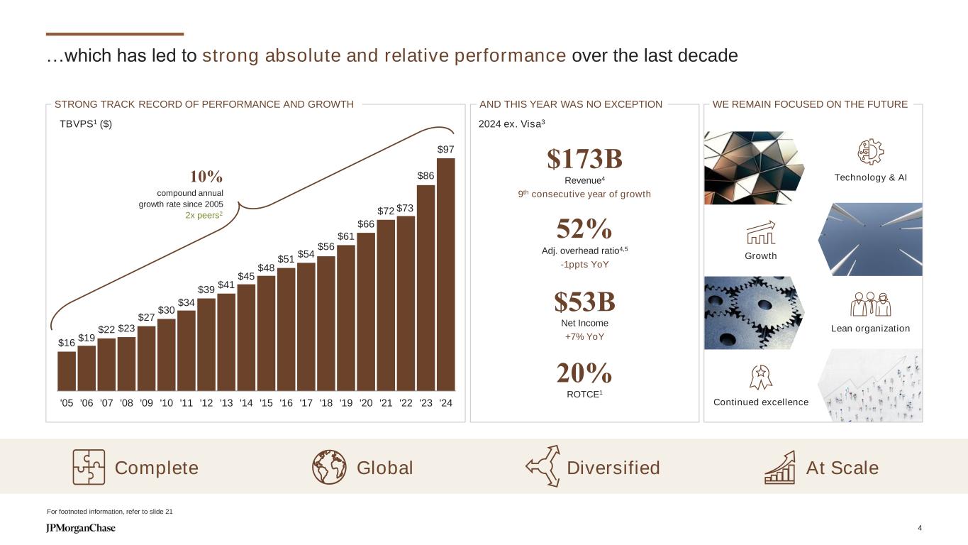 We have leading client and customer centric franchises… CCB CIB AWM #1 IB fees4 Markets revenue5 Treasury Services revenue6 Multifamily lender13 Middle Market bookrunner14 U.S. retail deposits1 U.S. credit card issuer11 Primary Business Bank12 #1#1 Rated Private Bank in the World15 Active flows16 10-year total return > 2x peers10 CCB U.S. retail deposits1 7.9% 11.3% Credit card OS2 16.4% 17.3% Client investment assets3 $213B $1.1T ⚫ #1 retail deposit share in 22 of the top 125 U.S. markets CIB Investment Banking fees4 8.2% 9.2% Markets revenue5 8.7% 11.4% Treasury Services revenue6 4.6% 9.5% Securities Services revenue7 9.1% 10.7% ⚫ Unrivaled scale, unique end-to-end capabilities AWM Client assets8 $2.3T $5.9T Long-term fund AUM outperforming over 10 years9 82% 85% ⚫ 21 straight years of net positive total client asset flows Market share 2014 2024 +340bps +260bps+90bps +3.5x5.1 +3.5x+157% +3.5x+300bps +3.5x+100bps +3.5x+270bps +3.5x+490bps +3.5x+160bps 2015: 2019: For footnoted information, refer to slide 20 3