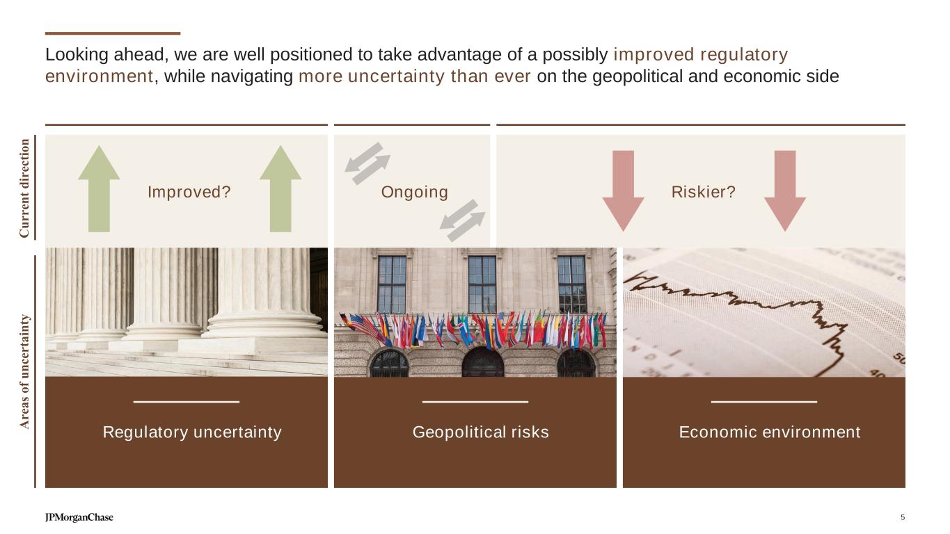 We remain focused on executing key strategic priorities through the cycle Driving client acquisition in high-potential markets and deepening relationships, through strategic client segmentation and tailored offerings EXPAND AND DEEPEN OUR CLIENT FRANCHISE Empowering our teams to serve clients in a highly-differentiated manner, while continuously attracting top-class talent INVEST IN OUR TEAMS Delivering more value to clients through innovative solutions, broad-based capabilities and targeted investments INNOVATE TO EXTEND OUR COMPETITIVE ADVANTAGES Preserving a strong credit and control culture through rigorous client selection, rooted in a long-term, through-the-cycle approach MAINTAIN FORTRESS PRINCIPLES Driving resilient and diversified earnings through ongoing expense discipline, long-term investments and a focus on capital efficiency DRIVE STRONG FINANCIAL PERFORMANCE Leveraging our rich data assets and cloud-based platforms to provide valuable insights across the firm and to clients HARNESS PROPRIETARY DATA TO DELIVER BUSINESS VALUE 4