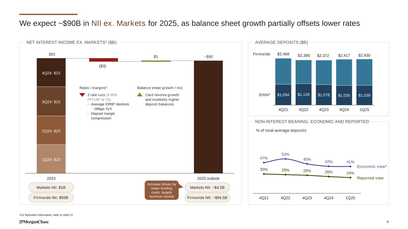 $89 ($3) $1 2024 2025 outlook Balance sheet growth / mix ◼ Card revolve growth and modestly higher deposit balances 47% 53% 45% 42% 41% 30% 29% 28% 26% 24% 4Q21 4Q22 4Q23 4Q24 1Q25 We expect ~$90B in NII ex. Markets for 2025, as balance sheet growth partially offsets lower rates Rates / margins2 ◼ 2 rate cuts (4.00% FFTUB3 at YE) – Average IORB4 declines ~90bps YoY – Deposit margin compression 2Q24: $23 3Q24: $23 4Q24: $23 $92 ~$90 1Q24: $23 Markets NII: $1B Firmwide NII: $93B Markets NII: ~$4.5B Firmwide NII: ~$94.5B Increase driven by lower funding costs, largely revenue neutral NET INTEREST INCOME EX. MARKETS1 ($B) NON-INTEREST BEARING: ECONOMIC AND REPORTED % of total average deposits AVERAGE DEPOSITS ($B) $1,094 $1,126 $1,078 $1,035 $1,039 $2,468 $2,380 $2,372 $2,417 $2,430 4Q21 4Q22 4Q23 4Q24 1Q25 Firmwide BWM5 Economic view6 Reported view For footnoted information, refer to slide 21 6