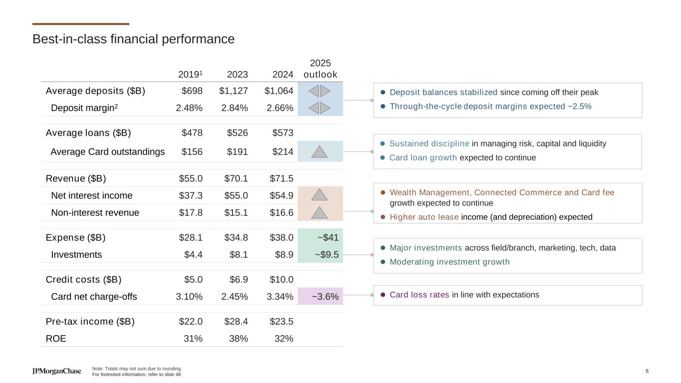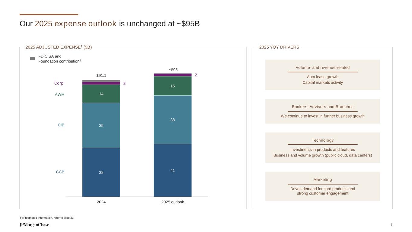 Best-in-class financial performance ⚫ Deposit balances stabilized since coming off their peak ⚫ Through-the-cycle deposit margins expected ~2.5% ⚫ Sustained discipline in managing risk, capital and liquidity ⚫ Card loan growth expected to continue ⚫ Major investments across field/branch, marketing, tech, data ⚫ Moderating investment growth ⚫ Card loss rates in line with expectations ⚫ Wealth Management, Connected Commerce and Card fee growth expected to continue ⚫ Higher auto lease income (and depreciation) expected 20191 2023 2024 2025 outlook Average deposits ($B) $698 $1,127 $1,064 Deposit margin2 2.48% 2.84% 2.66% Average loans ($B) $478 $526 $573 Average Card outstandings $156 $191 $214 Revenue ($B) $55.0 $70.1 $71.5 Net interest income $37.3 $55.0 $54.9 Non-interest revenue $17.8 $15.1 $16.6 Expense ($B) $28.1 $34.8 $38.0 ~$41 Investments $4.4 $8.1 $8.9 ~$9.5 Credit costs ($B) $5.0 $6.9 $10.0 Card net charge-offs 3.10% 2.45% 3.34% ~3.6% Pre-tax income ($B) $22.0 $28.4 $23.5 ROE 31% 38% 32% Note: Totals may not sum due to rounding For footnoted information, refer to slide 48 6