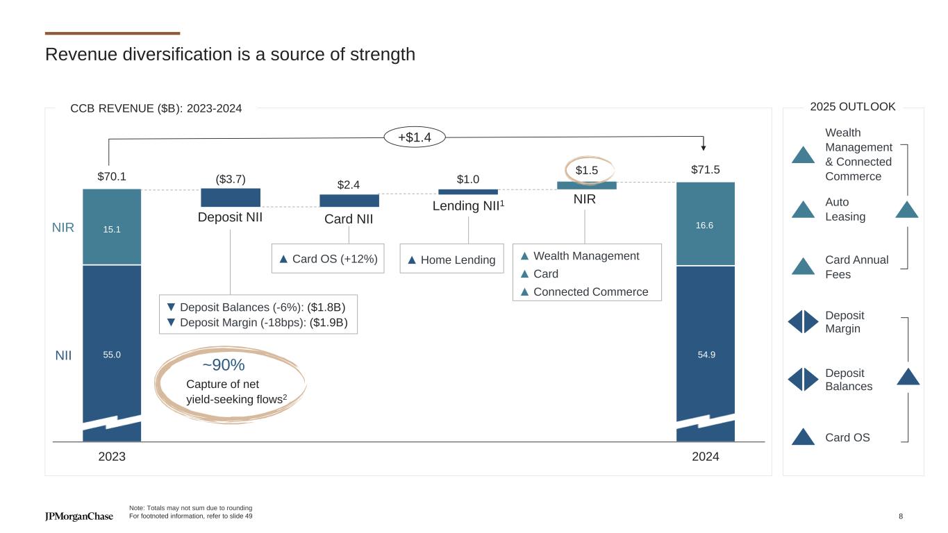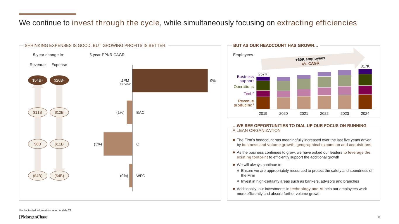 Our 2025 expense outlook is unchanged at ~$95B 2025 ADJUSTED EXPENSE1 ($B) $91.1 CIB AWM Corp. CCB ~$95 FDIC SA and Foundation contribution2 For footnoted information, refer to slide 21 38 41 35 38 14 15 2 2 2024 2025 outlook 2025 YOY DRIVERS Volume- and revenue-related Auto lease growth Capital markets activity Bankers, Advisors and Branches We continue to invest in further business growth Technology Investments in products and features Business and volume growth (public cloud, data centers) Marketing Drives demand for card products and strong customer engagement 7