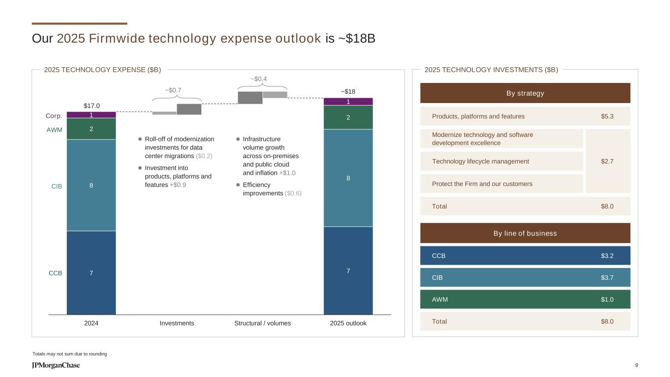 7 7 8 8 2 21 1 2024 Investments Structural / volumes 2025 outlook ~$0.7 Our 2025 Firmwide technology expense outlook is ~$18B 2025 TECHNOLOGY EXPENSE ($B) 2025 TECHNOLOGY INVESTMENTS ($B) Products, platforms and features By strategy $5.3 $2.7 Total $8.0 By line of business CCB $3.2 CIB $3.7 AWM $1.0 Total $8.0 Protect the Firm and our customers Modernize technology and software development excellence Technology lifecycle management $17.0 ~$18 CCB CIB AWM Corp. ⚫ Roll-off of modernization investments for data center migrations ($0.2) ⚫ Investment into products, platforms and features +$0.9 ⚫ Infrastructure volume growth across on-premises and public cloud and inflation +$1.0 ⚫ Efficiency improvements ($0.6) ~$0.4 Totals may not sum due to rounding 9