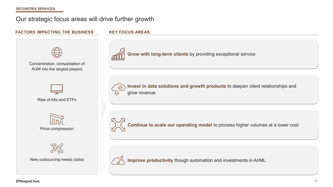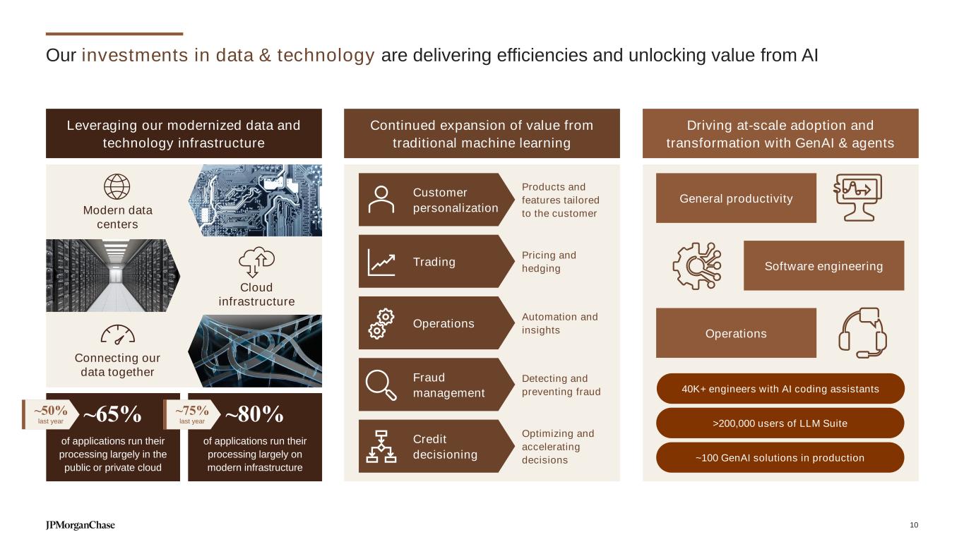 Our investments in data & technology are delivering efficiencies and unlocking value from AI Leveraging our modernized data and technology infrastructure Modern data centers Cloud infrastructure Driving at-scale adoption and transformation with GenAI & agents Connecting our data together Software engineering Operations General productivity >200,000 users of LLM Suite ~100 GenAI solutions in production 40K+ engineers with AI coding assistants of applications run their processing largely on modern infrastructure ~80% of applications run their processing largely in the public or private cloud ~65%~50% last year ~75% last year Continued expansion of value from traditional machine learning Pricing and hedging Trading Detecting and preventing fraud Fraud management Automation and insights Operations Products and features tailored to the customer Customer personalization Optimizing and accelerating decisions Credit decisioning 10