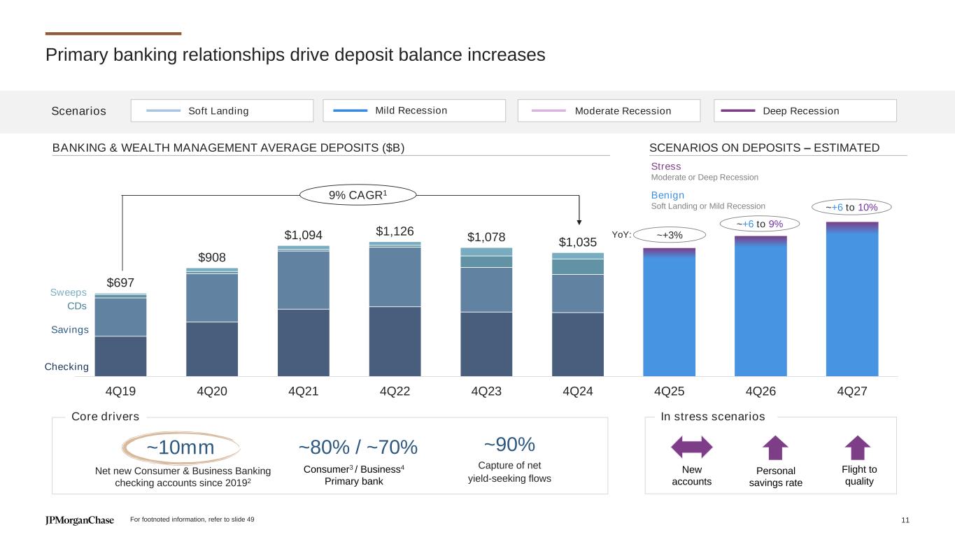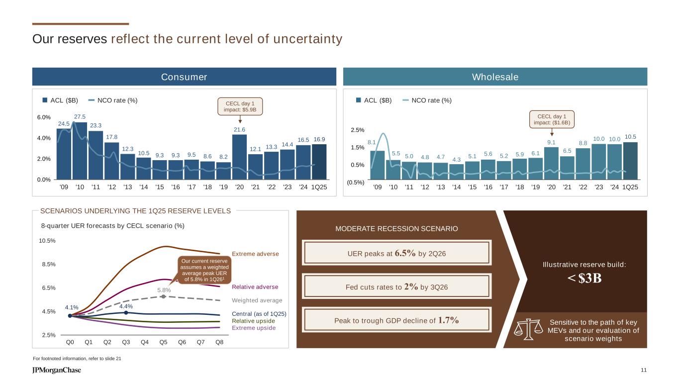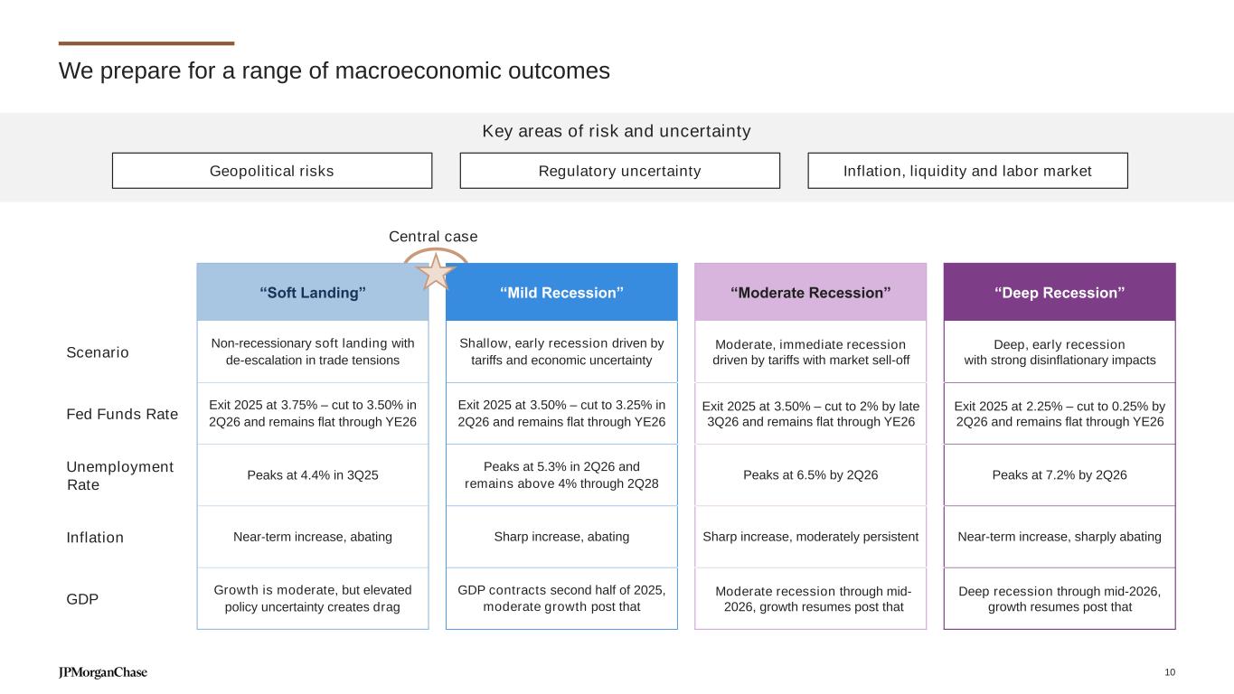 We prepare for a range of macroeconomic outcomes “Soft Landing” “Mild Recession” “Moderate Recession” “Deep Recession” Scenario Non-recessionary soft landing with de-escalation in trade tensions Shallow, early recession driven by tariffs and economic uncertainty Moderate, immediate recession driven by tariffs with market sell-off Deep, early recession with strong disinflationary impacts Fed Funds Rate Exit 2025 at 3.75% – cut to 3.50% in 2Q26 and remains flat through YE26 Exit 2025 at 3.50% – cut to 3.25% in 2Q26 and remains flat through YE26 Exit 2025 at 3.50% – cut to 2% by late 3Q26 and remains flat through YE26 Exit 2025 at 2.25% – cut to 0.25% by 2Q26 and remains flat through YE26 Unemployment Rate Peaks at 4.4% in 3Q25 Peaks at 5.3% in 2Q26 and remains above 4% through 2Q28 Peaks at 6.5% by 2Q26 Peaks at 7.2% by 2Q26 Inflation Near-term increase, abating Sharp increase, abating Sharp increase, moderately persistent Near-term increase, sharply abating GDP Growth is moderate, but elevated policy uncertainty creates drag GDP contracts second half of 2025, moderate growth post that Moderate recession through mid- 2026, growth resumes post that Deep recession through mid-2026, growth resumes post that Key areas of risk and uncertainty Inflation, liquidity and labor marketRegulatory uncertaintyGeopolitical risks Central case 10