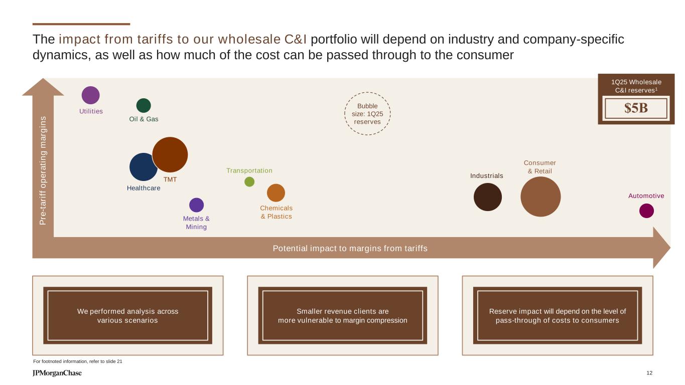 Our reserves reflect the current level of uncertainty For footnoted information, refer to slide 21 Illustrative reserve build: < $3B Sensitive to the path of key MEVs and our evaluation of scenario weights Scenario MODERATE RECESSION SCENARIO UER peaks at 6.5% by 2Q26 Fed cuts rates to 2% by 3Q26 Peak to trough GDP decline of 1.7% SCENARIOS UNDERLYING THE 1Q25 RESERVE LEVELS 8-quarter UER forecasts by CECL scenario (%) 4.1% 4.4% 5.8% 2.5% 4.5% 6.5% 8.5% 10.5% Q0 Q1 Q2 Q3 Q4 Q5 Q6 Q7 Q8 Extreme adverse Relative adverse Weighted average Central (as of 1Q25) Relative upside Extreme upside Our current reserve assumes a weighted average peak UER of 5.8% in 1Q261 11 24.5 27.5 23.3 17.8 12.3 10.5 9.3 9.3 9.5 8.6 8.2 21.6 12.1 13.3 14.4 16.5 16.9 '09 '10 '11 '12 '13 '14 '15 '16 '17 '18 '19 '20 '21 '22 '23 '24 '25 0.0% 2.0% 4.0% 6.0% 5.0 4.8 4.7 4.3 5.1 5.6 5.2 5.9 6.1 9.1 6.5 8.8 10.0 10.0 10.5 '09 '10 '11 '12 '13 '14 '15 '16 '17 '18 '19 '20 '21 '22 '23 '24 '25 (0.5%) 0.5% 1.5% 2.5% Consumer Wholesale ACL ($B) NCO rate (%) ACL ($B) NCO rate (%) 8.1 5.5 1Q25 1Q25 CECL day 1 impact: $5.9B CECL day 1 impact: ($1.6B)