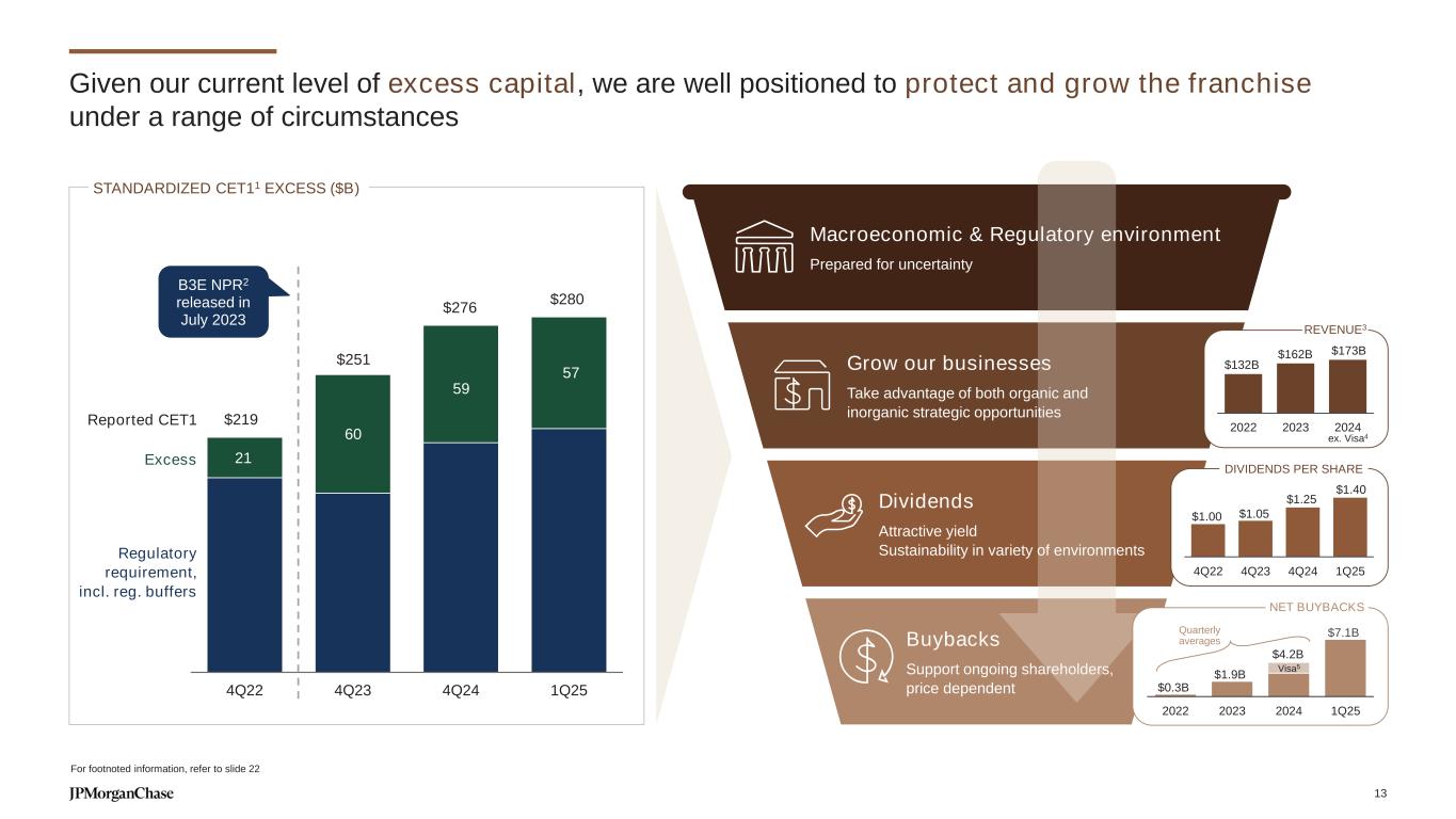 Given our current level of excess capital, we are well positioned to protect and grow the franchise under a range of circumstances $219 $251 $276 $280 21 60 59 57 4Q22 4Q23 4Q24 1Q25 Regulatory requirement, incl. reg. buffers Excess Reported CET1 STANDARDIZED CET11 EXCESS ($B) $132B $162B $173B 2022 2023 2024 REVENUE3 B3E NPR2 released in July 2023 Buybacks Support ongoing shareholders, price dependent Grow our businesses Take advantage of both organic and inorganic strategic opportunities Macroeconomic & Regulatory environment Prepared for uncertainty For footnoted information, refer to slide 22 Dividends Attractive yield Sustainability in variety of environments $1.00 $1.05 $1.25 $1.40 4Q22 4Q23 4Q24 1Q25 DIVIDENDS PER SHARE NET BUYBACKS Quarterly averages $0.3B $1.9B $7.1B 2022 2023 2024 1Q25 $4.2B Visa5 ex. Visa4 13