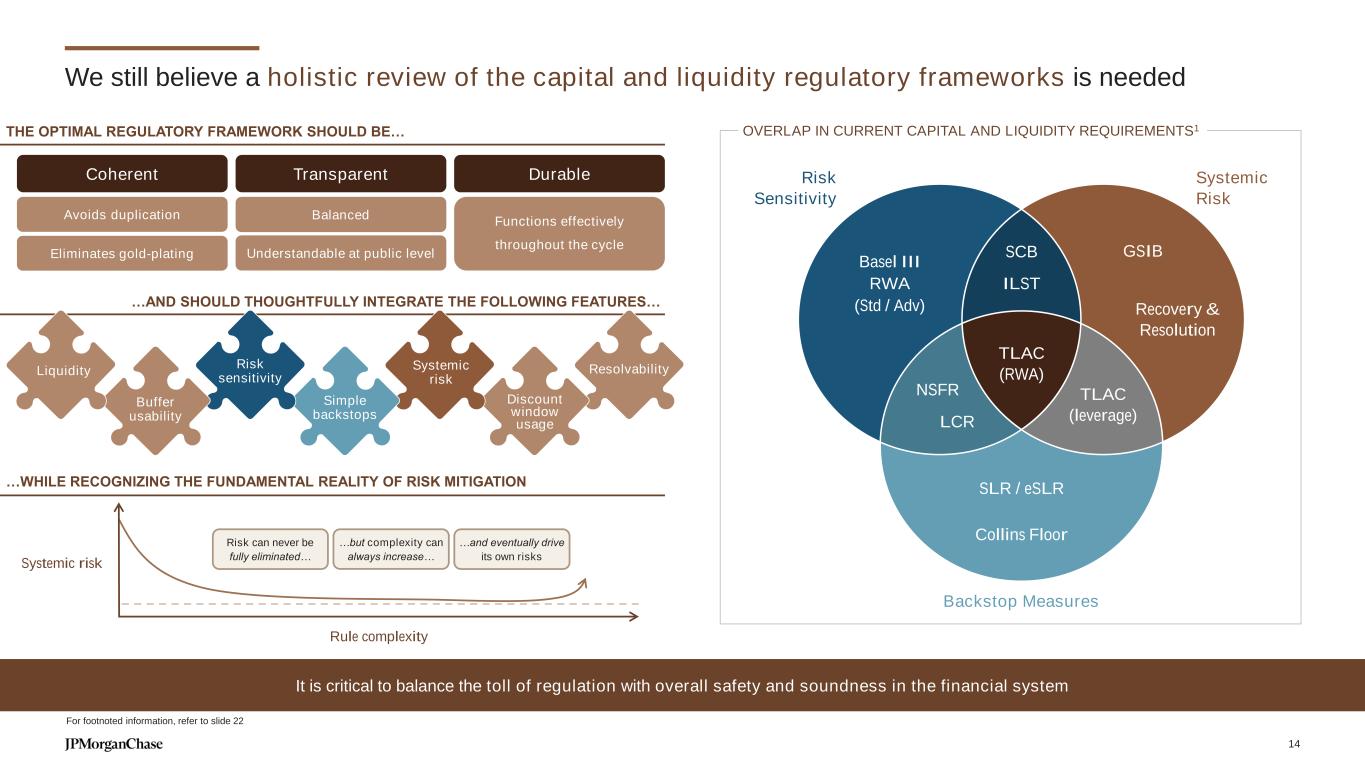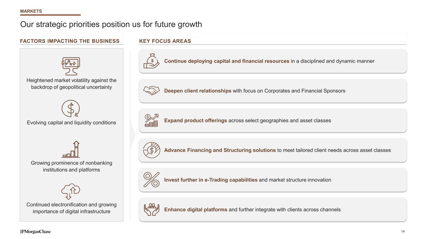 Despite our industry-leading position, further opportunities remain CLIENT WALLET AND MARKET SHARE Corporate wallet 2019 2024 SoW change (2019-2024) FICC EQUITIES $6.3 $14.7 2019 $9.9 $20.1 2024 $21.0 $30.0 Equities FICC 11.4%Market share2 11.4% #1 #1Rank2 PRODUCT REVENUE1 AND MARKET SHARE2 ▲ 6.4% ▲ 9.7% 5Y CAGR3 FINANCIAL PERFORMANCE Institutional wallet 2019 2024 Large Institutional4 Mid-Size / Small Institutional4 SoW change (2019-2024) ▲ 230bps ▲ 180bps NOT TO SCALE Corporate5 #1 rank2 (tied) #2 rank2#1 rank2 10% 11% 11% 12% 12% 13% 13% 2019 2020 2021 2022 2023 2024 11.1% 12.2% 11.8% 12.9% 12.2% 12.4% Revenues in $B #1 rank2 7% 8% 9% 10% 11% 12% 2019 2020 2021 2022 2023 2024 11.6% 12.8% 12.2% 10.7% 10.8% 10.9% ▲ 6.4% 5Y wallet CAGR3 5Y wallet CAGR3 ▲ 7.8% 0.6% For footnoted information, refer to slide 40 ▲ 30bps MARKETS 13