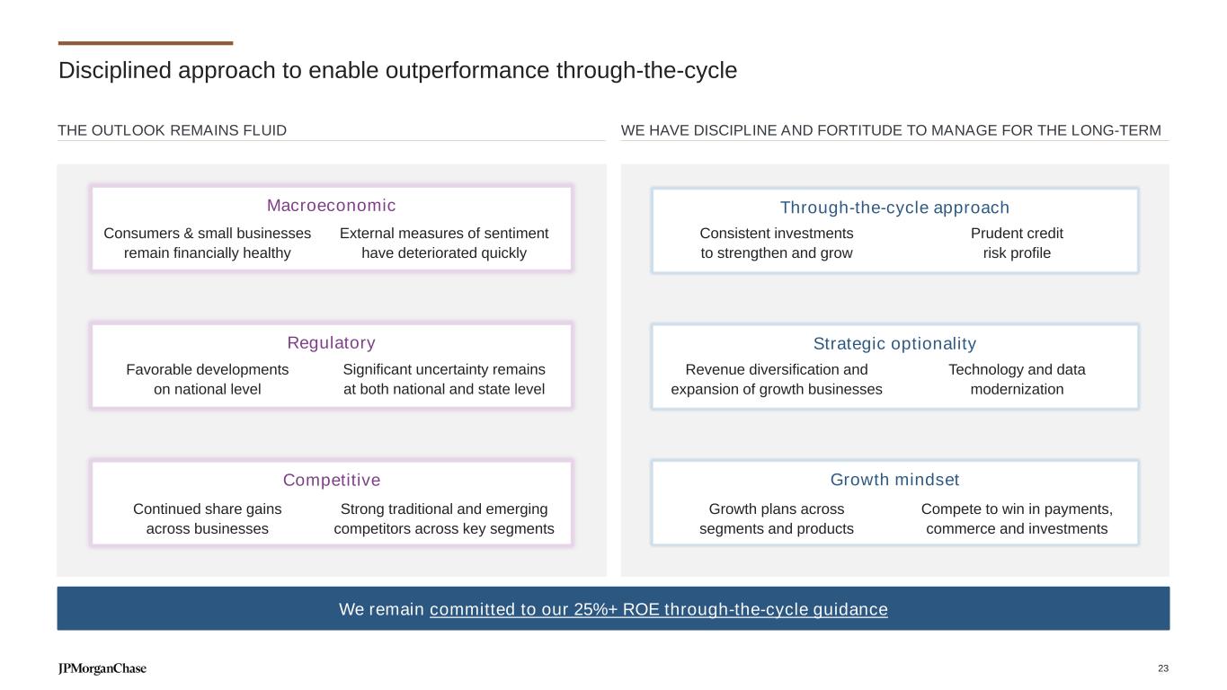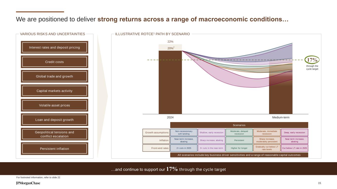 2024 Medium-term We are positioned to deliver strong returns across a range of macroeconomic conditions… …and continue to support our 17% through the cycle target For footnoted information, refer to slide 22 17% through the cycle target 20% 22% Interest rates and deposit pricing Credit costs Global trade and growth Capital markets activity Volatile asset prices Loan and deposit growth Geopolitical tensions and conflict escalation Persistent inflation ILLUSTRATIVE ROTCE1 PATH BY SCENARIOVARIOUS RISKS AND UNCERTAINTIES 2 Scenarios All scenarios include key business driver sensitivities and a range of reasonable capital outcomes Front-end rates Inflation Growth assumptions Moderate, immediate recession Moderate, delayed recession Gradually cut below LT rate levels Higher for longer Sharp increase, moderately persistent Persistent Deep, early recession Cut below LT rate in 2025 Near-term increase, abating Shallow, early recession 3+ cuts in the near-term Sharp increase, abating Non-recessionary soft landing 2+ cuts in 2025 Near-term increase, abating 15