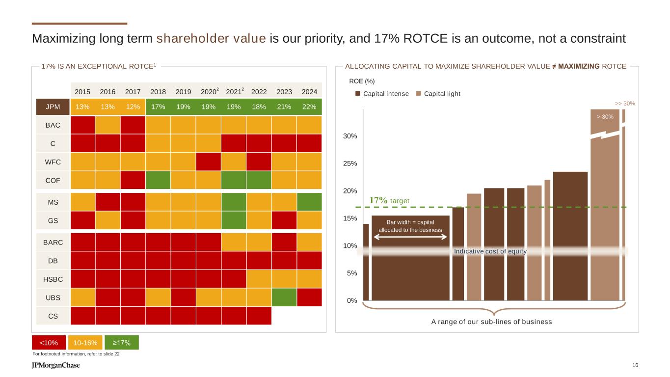 0% 5% 10% 15% 20% 25% 30% Maximizing long term shareholder value is our priority, and 17% ROTCE is an outcome, not a constraint 17% target ROE (%) A range of our sub-lines of business Indicative cost of equity 17% IS AN EXCEPTIONAL ROTCE1 JPM 13% 13% 12% 17% 19% 19% 19% 18% 21% 22% BAC C WFC COF MS GS BARC DB HSBC UBS CS 2015 2016 2017 2018 2019 2020 2021 2022 2023 2024 ≥17%<10% 10-16% > 30% >> 30% Capital intense Capital light ALLOCATING CAPITAL TO MAXIMIZE SHAREHOLDER VALUE ≠ MAXIMIZING ROTCE Bar width = capital allocated to the business For footnoted information, refer to slide 22 2 2 16