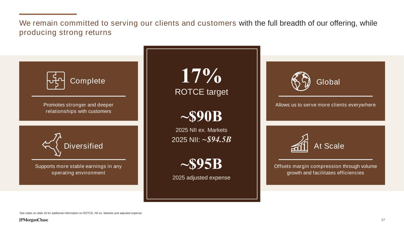 We remain committed to serving our clients and customers with the full breadth of our offering, while producing strong returns Promotes stronger and deeper relationships with customers Allows us to serve more clients everywhere Supports more stable earnings in any operating environment Offsets margin compression through volume growth and facilitates efficiencies Complete Global Diversified At Scale See notes on slide 18 for additional information on ROTCE, NII ex. Markets and adjusted expense ~$90B 2025 NII ex. Markets 2025 NII: ~$94.5B ~$95B 2025 adjusted expense 17% ROTCE target 17