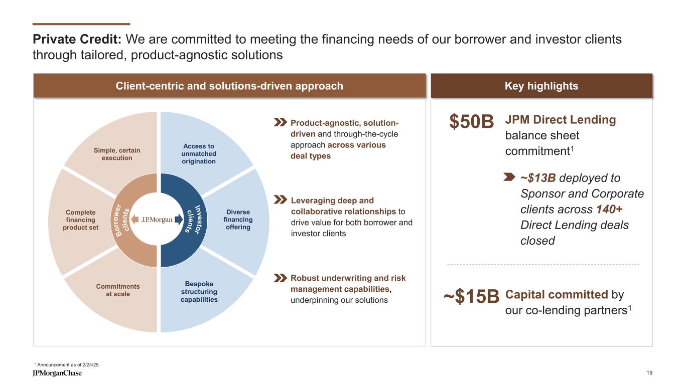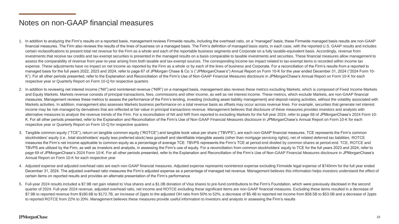 Notes on non-GAAP financial measures 1. In addition to analyzing the Firm’s results on a reported basis, management reviews Firmwide results, including the overhead ratio, on a “managed” basis; these Firmwide managed basis results are non-GAAP financial measures. The Firm also reviews the results of the lines of business on a managed basis. The Firm’s definition of managed basis starts, in each case, with the reported U.S. GAAP results and includes certain reclassifications to present total net revenue for the Firm as a whole and each of the reportable business segments and Corporate on a fully taxable-equivalent basis. Accordingly, revenue from investments that receive tax credits and tax-exempt securities is presented in the managed results on a basis comparable to taxable investments and securities. These financial measures allow management to assess the comparability of revenue from year-to-year arising from both taxable and tax-exempt sources. The corresponding income tax impact related to tax-exempt items is recorded within income tax expense. These adjustments have no impact on net income as reported by the Firm as a whole or by each of the lines of business and Corporate. For a reconciliation of the Firm’s results from a reported to managed basis for the full years 2022, 2023 and 2024, refer to page 67 of JPMorgan Chase & Co.’s (“JPMorganChase’s”) Annual Report on Form 10-K for the year ended December 31, 2024 (“2024 Form 10- K”). For all other periods presented, refer to the Explanation and Reconciliation of the Firm’s Use of Non-GAAP Financial Measures disclosure in JPMorganChase’s Annual Report on Form 10-K for each respective year or Quarterly Report on Form 10-Q for respective quarters 2. In addition to reviewing net interest income (“NII”) and noninterest revenue (“NIR”) on a managed basis, management also reviews these metrics excluding Markets, which is composed of Fixed Income Markets and Equity Markets. Markets revenue consists of principal transactions, fees, commissions and other income, as well as net interest income. These metrics, which exclude Markets, are non-GAAP financial measures. Management reviews these metrics to assess the performance of the Firm’s lending, investing (including asset-liability management) and deposit-raising activities, without the volatility associated with Markets activities. In addition, management also assesses Markets business performance on a total revenue basis as offsets may occur across revenue lines. For example, securities that generate net interest income may be risk-managed by derivatives that are reflected at fair value in principal transactions revenue. Management believes that disclosure of these measures provides investors and analysts with alternative measures to analyze the revenue trends of the Firm. For a reconciliation of NII and NIR from reported to excluding Markets for the full year 2024, refer to page 68 of JPMorganChase’s 2024 Form 10- K. For all other periods presented, refer to the Explanation and Reconciliation of the Firm’s Use of Non-GAAP Financial Measures disclosure in JPMorganChase’s Annual Report on Form 10-K for each respective year or Quarterly Report on Form 10-Q for respective quarters 3. Tangible common equity (“TCE”), return on tangible common equity (“ROTCE”) and tangible book value per share (“TBVPS”), are each non-GAAP financial measures. TCE represents the Firm’s common stockholders’ equity (i.e., total stockholders’ equity less preferred stock) less goodwill and identifiable intangible assets (other than mortgage servicing rights), net of related deferred tax liabilities. ROTCE measures the Firm’s net income applicable to common equity as a percentage of average TCE. TBVPS represents the Firm’s TCE at period-end divided by common shares at period-end. TCE, ROTCE and TBVPS are utilized by the Firm, as well as investors and analysts, in assessing the Firm’s use of equity. For a reconciliation from common stockholders’ equity to TCE for the full years 2023 and 2024, refer to page 69 of JPMorganChase’s 2024 Form 10-K. For all other periods presented, refer to the Explanation and Reconciliation of the Firm’s Use of Non-GAAP Financial Measures disclosure in JPMorganChase’s Annual Report on Form 10-K for each respective year 4. Adjusted expense and adjusted overhead ratio are each non-GAAP financial measures. Adjusted expense represents noninterest expense excluding Firmwide legal expense of $740mm for the full year ended December 31, 2024. The adjusted overhead ratio measures the Firm’s adjusted expense as a percentage of managed net revenue. Management believes this information helps investors understand the effect of certain items on reported results and provides an alternate presentation of the Firm’s performance 5. Full-year 2024 results included a $7.9B net gain related to Visa shares and a $1.0B donation of Visa shares to pre-fund contributions to the Firm’s Foundation, which were previously disclosed in the second quarter of 2024. Full-year 2024 revenue, adjusted overhead ratio, net income and ROTCE excluding these significant items are non-GAAP financial measures. Excluding these items resulted in a decrease of $7.9B to reported revenue from $180.6B to $172.7B, an increase of 2ppts to the adjusted OH ratio from 50% to 52%, a decrease of $5.4B to reported net income from $58.5B to $53.0B and a decrease of 2ppts to reported ROTCE from 22% to 20%. Management believes these measures provide useful information to investors and analysts in assessing the Firm’s results 18