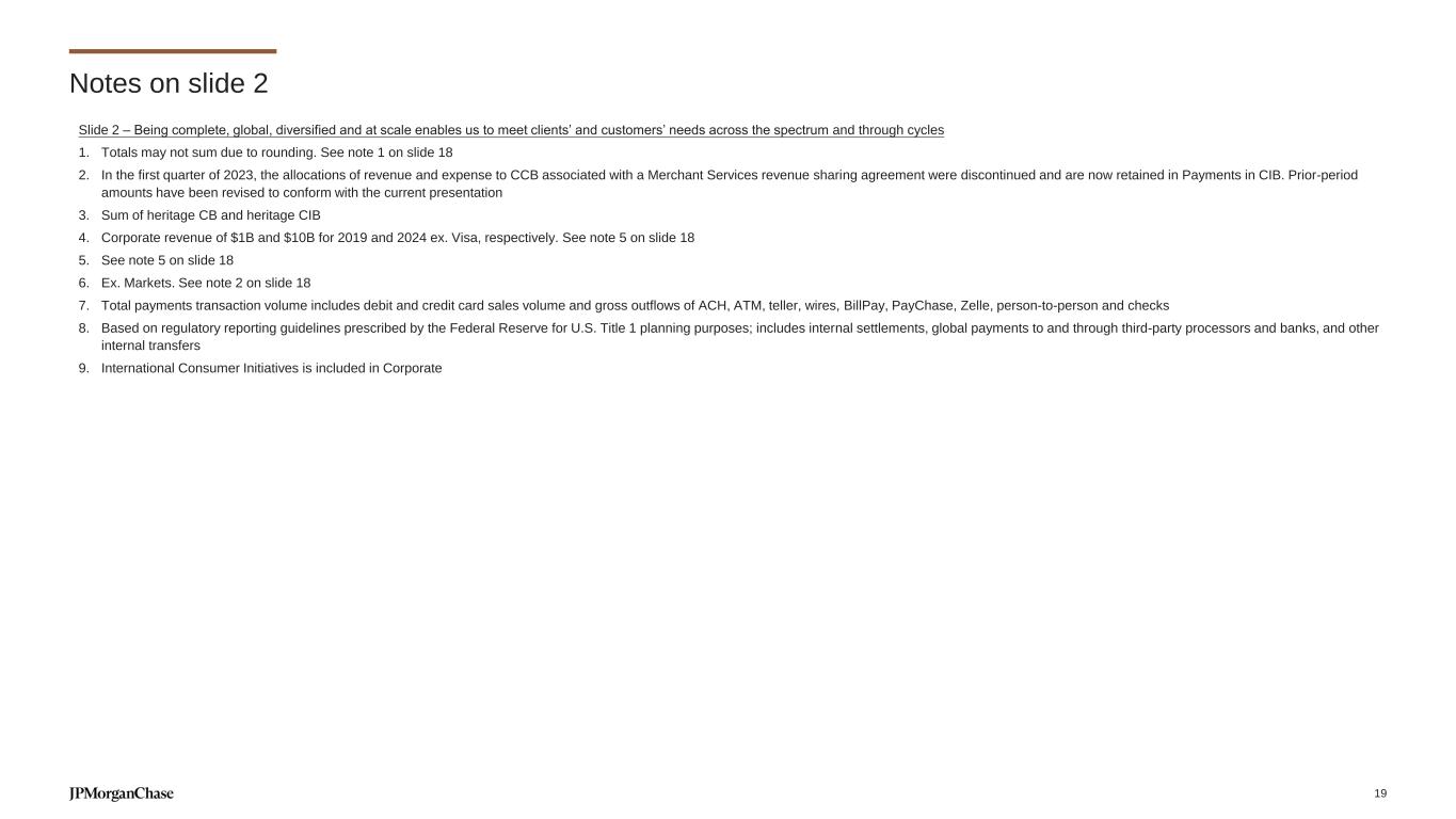 Notes on slide 2 Slide 2 – Being complete, global, diversified and at scale enables us to meet clients’ and customers’ needs across the spectrum and through cycles 1. Totals may not sum due to rounding. See note 1 on slide 18 2. In the first quarter of 2023, the allocations of revenue and expense to CCB associated with a Merchant Services revenue sharing agreement were discontinued and are now retained in Payments in CIB. Prior-period amounts have been revised to conform with the current presentation 3. Sum of heritage CB and heritage CIB 4. Corporate revenue of $1B and $10B for 2019 and 2024 ex. Visa, respectively. See note 5 on slide 18 5. See note 5 on slide 18 6. Ex. Markets. See note 2 on slide 18 7. Total payments transaction volume includes debit and credit card sales volume and gross outflows of ACH, ATM, teller, wires, BillPay, PayChase, Zelle, person-to-person and checks 8. Based on regulatory reporting guidelines prescribed by the Federal Reserve for U.S. Title 1 planning purposes; includes internal settlements, global payments to and through third-party processors and banks, and other internal transfers 9. International Consumer Initiatives is included in Corporate 19