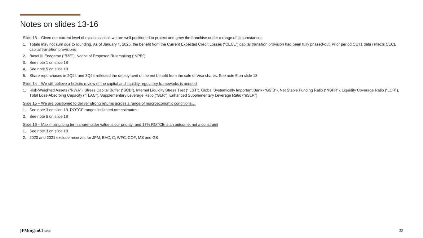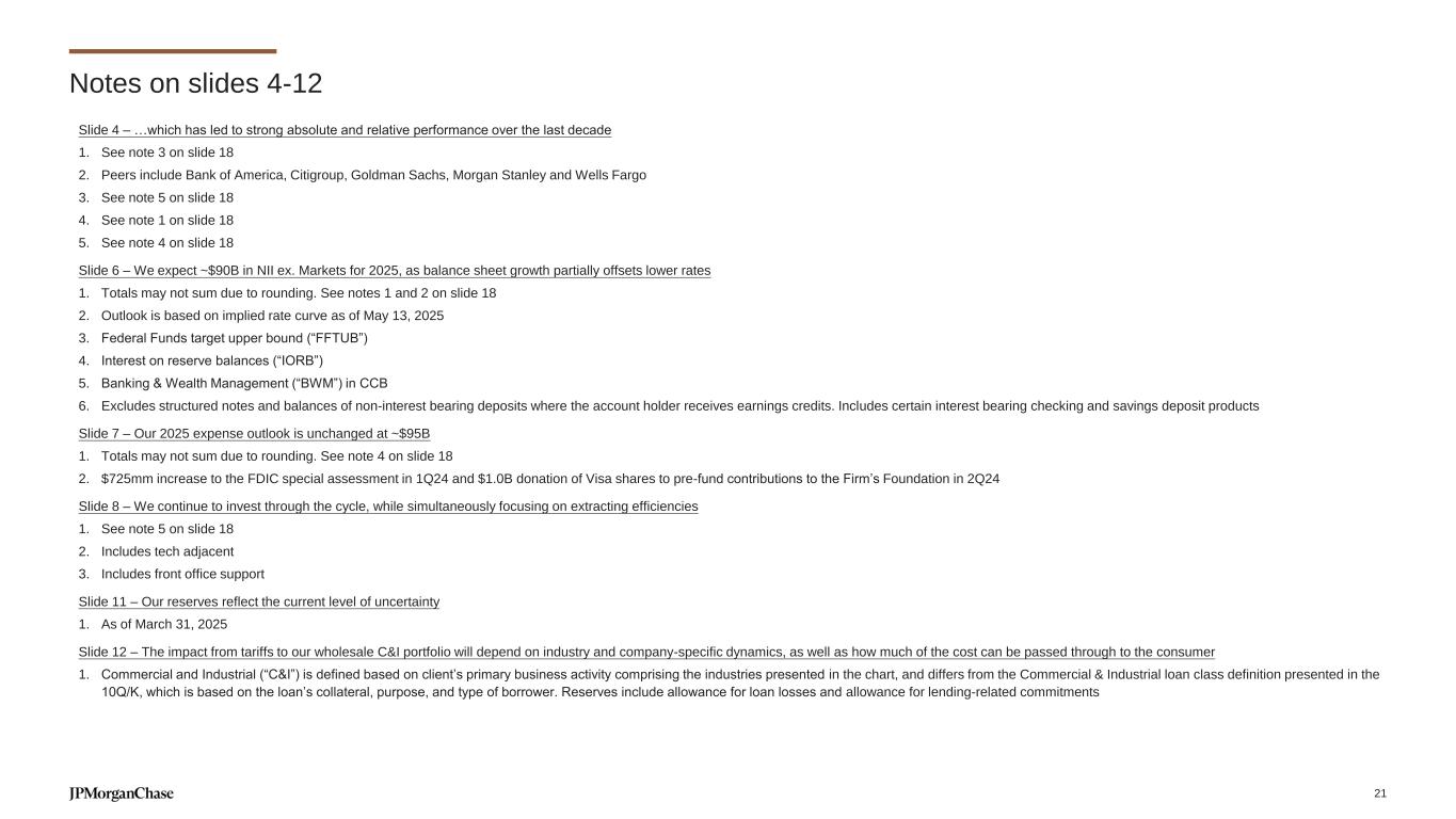 Notes on slides 4-12 Slide 4 – …which has led to strong absolute and relative performance over the last decade 1. See note 3 on slide 18 2. Peers include Bank of America, Citigroup, Goldman Sachs, Morgan Stanley and Wells Fargo 3. See note 5 on slide 18 4. See note 1 on slide 18 5. See note 4 on slide 18 Slide 6 – We expect ~$90B in NII ex. Markets for 2025, as balance sheet growth partially offsets lower rates 1. Totals may not sum due to rounding. See notes 1 and 2 on slide 18 2. Outlook is based on implied rate curve as of May 13, 2025 3. Federal Funds target upper bound (“FFTUB”) 4. Interest on reserve balances (“IORB”) 5. Banking & Wealth Management (“BWM”) in CCB 6. Excludes structured notes and balances of non-interest bearing deposits where the account holder receives earnings credits. Includes certain interest bearing checking and savings deposit products Slide 7 – Our 2025 expense outlook is unchanged at ~$95B 1. Totals may not sum due to rounding. See note 4 on slide 18 2. $725mm increase to the FDIC special assessment in 1Q24 and $1.0B donation of Visa shares to pre-fund contributions to the Firm’s Foundation in 2Q24 Slide 8 – We continue to invest through the cycle, while simultaneously focusing on extracting efficiencies 1. See note 5 on slide 18 2. Includes tech adjacent 3. Includes front office support Slide 11 – Our reserves reflect the current level of uncertainty 1. As of March 31, 2025 Slide 12 – The impact from tariffs to our wholesale C&I portfolio will depend on industry and company-specific dynamics, as well as how much of the cost can be passed through to the consumer 1. Commercial and Industrial (“C&I”) is defined based on client’s primary business activity comprising the industries presented in the chart, and differs from the Commercial & Industrial loan class definition presented in the 10Q/K, which is based on the loan’s collateral, purpose, and type of borrower. Reserves include allowance for loan losses and allowance for lending-related commitments 21
