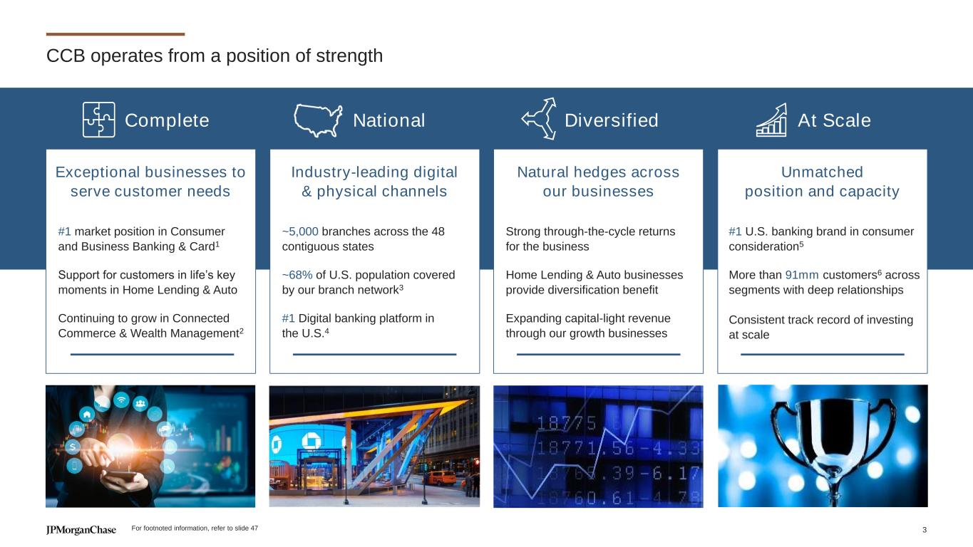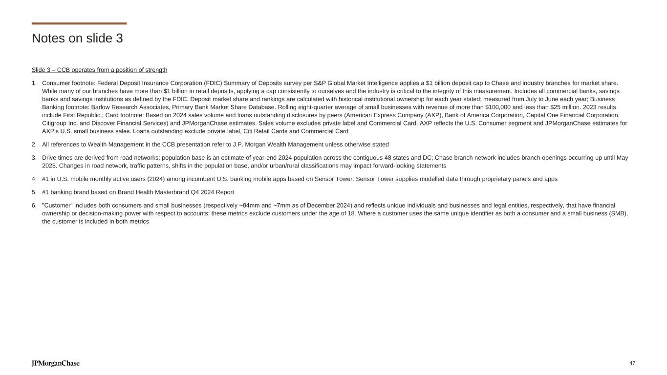Slide 3 – CCB operates from a position of strength 1. Consumer footnote: Federal Deposit Insurance Corporation (FDIC) Summary of Deposits survey per S&P Global Market Intelligence applies a $1 billion deposit cap to Chase and industry branches for market share. While many of our branches have more than $1 billion in retail deposits, applying a cap consistently to ourselves and the industry is critical to the integrity of this measurement. Includes all commercial banks, savings banks and savings institutions as defined by the FDIC. Deposit market share and rankings are calculated with historical institutional ownership for each year stated; measured from July to June each year; Business Banking footnote: Barlow Research Associates, Primary Bank Market Share Database. Rolling eight-quarter average of small businesses with revenue of more than $100,000 and less than $25 million. 2023 results include First Republic.; Card footnote: Based on 2024 sales volume and loans outstanding disclosures by peers (American Express Company (AXP), Bank of America Corporation, Capital One Financial Corporation, Citigroup Inc. and Discover Financial Services) and JPMorganChase estimates. Sales volume excludes private label and Commercial Card. AXP reflects the U.S. Consumer segment and JPMorganChase estimates for AXP’s U.S. small business sales. Loans outstanding exclude private label, Citi Retail Cards and Commercial Card 2. All references to Wealth Management in the CCB presentation refer to J.P. Morgan Wealth Management unless otherwise stated 3. Drive times are derived from road networks; population base is an estimate of year-end 2024 population across the contiguous 48 states and DC; Chase branch network includes branch openings occurring up until May 2025. Changes in road network, traffic patterns, shifts in the population base, and/or urban/rural classifications may impact forward-looking statements 4. #1 in U.S. mobile monthly active users (2024) among incumbent U.S. banking mobile apps based on Sensor Tower. Sensor Tower supplies modelled data through proprietary panels and apps 5. #1 banking brand based on Brand Health Masterbrand Q4 2024 Report 6. "Customer” includes both consumers and small businesses (respectively ~84mm and ~7mm as of December 2024) and reflects unique individuals and businesses and legal entities, respectively, that have financial ownership or decision-making power with respect to accounts; these metrics exclude customers under the age of 18. Where a customer uses the same unique identifier as both a consumer and a small business (SMB), the customer is included in both metrics Notes on slide 3 47