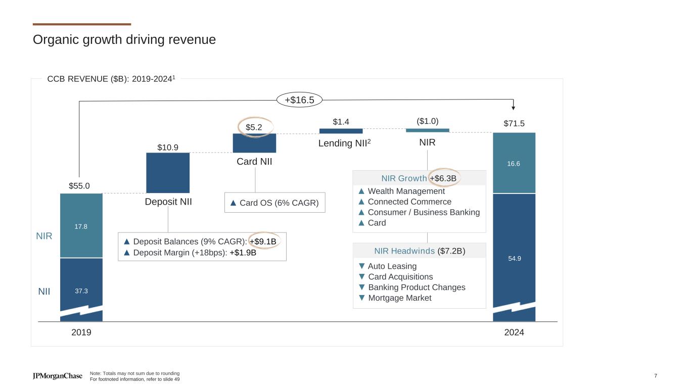 $37.3 $54.9 $17.6 $16.6 $10.9 $5.2 $1.4 ($1.0) $55.0 $71.5 2019 Deposit NII Card NII Other NII NIR 2024 Organic growth driving revenue CCB REVENUE ($B): 2019-20241 NIR NII Deposit NII Card NII NIRLending NII2 ▲ Deposit Balances (9% CAGR): +$9.1B ▲ Deposit Margin (+18bps): +$1.9B ▲ Card OS (6% CAGR) ▲ Wealth Management ▲ Connected Commerce ▲ Consumer / Business Banking ▲ Card ▼ Auto Leasing ▼ Card Acquisitions ▼ Banking Product Changes ▼ Mortgage Market NIR Headwinds ($7.2B) NIR Growth +$6.3B +$16.5 7.8 6.6 7.3 .9 Note: Totals may not sum due to rounding For footnoted information, refer to slide 49 7