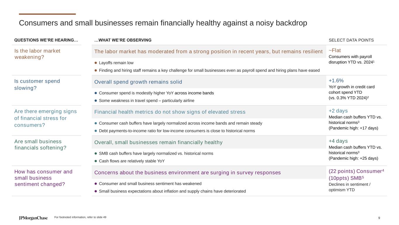 $55.0 $54.9 $15.1 $16.6 $2.4 $1.0 $1.5 ($3.7)$70.1 $71.5 2023 Deposit NII Card NII Other NII NIR 2024 Revenue diversification is a source of strength NIR NII Deposit NII Card NII NIR Lending NII1 ▲ Wealth Management ▲ Card ▲ Connected Commerce ▲ Home Lending Card Annual Fees Wealth Management & Connected Commerce Card OS Deposit Margin Deposit Balances Auto Leasing ▼ Deposit Balances (-6%): ($1.8B) ▼ Deposit Margin (-18bps): ($1.9B) ▲ Card OS (+12%) +$1.4 CCB REVENUE ($B): 2023-2024 ~90% Capture of net yield-seeking flows2 2025 OUTLOOK 5.1 5.0 6.6 .9 Note: Totals may not sum due to rounding For footnoted information, refer to slide 49 8