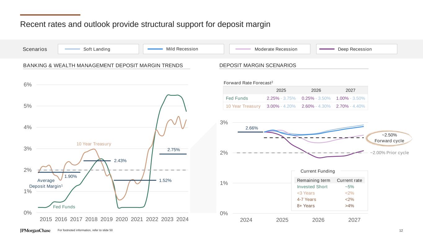 $697 $908 $1,094 $1,126 $1,078 $1,035 4Q19 4Q20 4Q21 4Q22 4Q23 4Q24 4Q25 4Q26 4Q27 Primary banking relationships drive deposit balance increases BANKING & WEALTH MANAGEMENT AVERAGE DEPOSITS ($B) Scenarios Deep RecessionSoft Landing Mild Recession Moderate Recession Checking Savings CDs ~+6 to 10% ~+6 to 9% Sweeps ~+3% 9% CAGR1 117 145 ~10mm Net new Consumer & Business Banking checking accounts since 20192 ~90% Capture of net yield-seeking flows In stress scenarios New accounts Consumer3 / Business4 Primary bank ~80% / ~70% Personal savings rate SCENARIOS ON DEPOSITS – ESTIMATED Stress Moderate or Deep Recession Benign Soft Landing or Mild Recession Core drivers Flight to quality YoY: For footnoted information, refer to slide 49 11