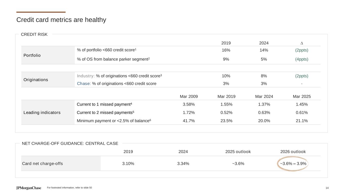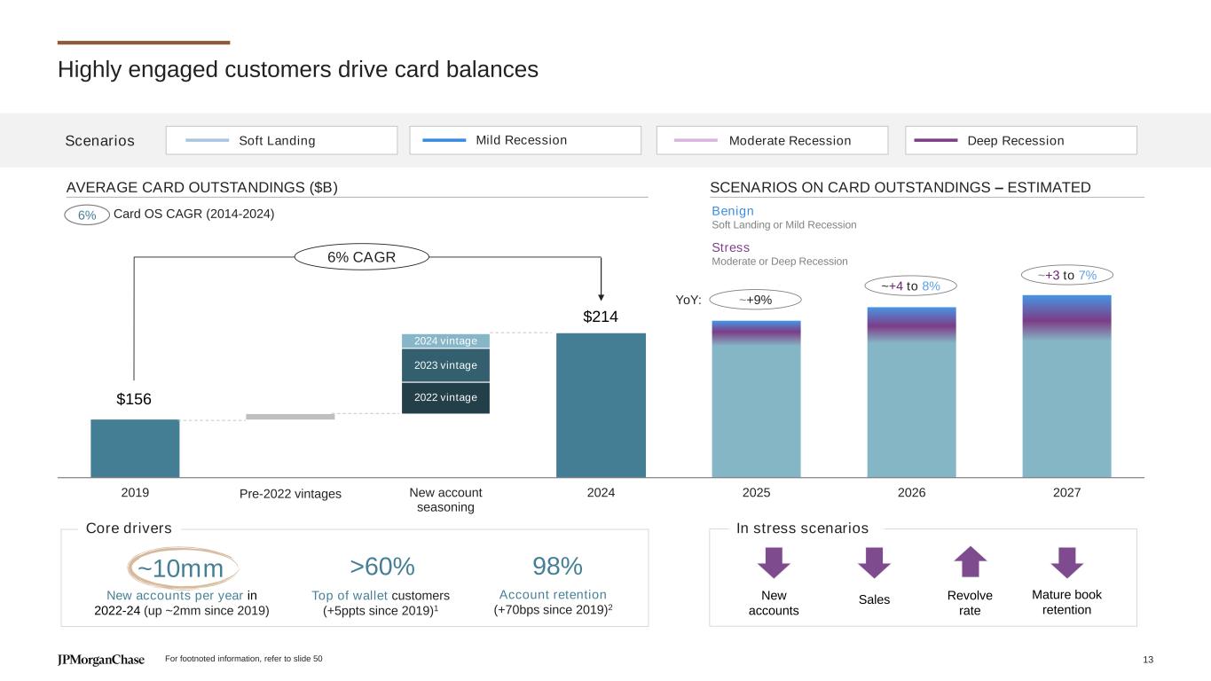 Highly engaged customers drive card balances 117 145 2023 Vintage 2022 Vintage $156 $214 2019 Pre-'22 vintages New account seasoning 2024 2025 2026 2027 6% CAGR 2022 vintage 2023 vintage 2024 vintage AVERAGE CARD OUTSTANDINGS ($B) SCENARIOS ON CARD OUTSTANDINGS – ESTIMATED Scenarios Deep RecessionSoft Landing Mild Recession Moderate Recession Stress Moderate or Deep Recession Benign Soft Landing or Mild Recession ~+9% ~+4 to 8% ~+3 to 7% >60% Top of wallet customers (+5ppts since 2019)1 ~10mm New accounts per year in 2022-24 (up ~2mm since 2019) 98% Account retention (+70bps since 2019)2 YoY: New accounts Revolve rate Mature book retention Sales 6% Card OS CAGR (2014-2024) In stress scenariosCore drivers For footnoted information, refer to slide 50 Pre-20 2 vintages 13