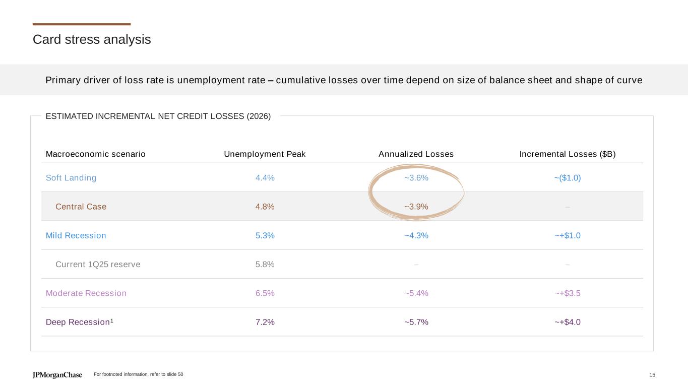 Credit card metrics are healthy 2019 2024 ∆ Portfolio % of portfolio <660 credit score1 16% 14% (2ppts) % of OS from balance parker segment2 9% 5% (4ppts) Originations Industry: % of originations <660 credit score3 10% 8% (2ppts) Chase: % of originations <660 credit score 3% 3% - Mar 2009 Mar 2019 Mar 2024 Mar 2025 Leading indicators Current to 1 missed payment4 3.58% 1.55% 1.37% 1.45% Current to 2 missed payments5 1.72% 0.52% 0.63% 0.61% Minimum payment or <2.5% of balance6 41.7% 23.5% 20.0% 21.1% 2019 2024 2025 outlook 2026 outlook Card net charge-offs 3.10% 3.34% ~3.6% ~3.6% – 3.9% CREDIT RISK For footnoted information, refer to slide 50 NET CHARGE-OFF GUIDANCE: CENTRAL CASE 14