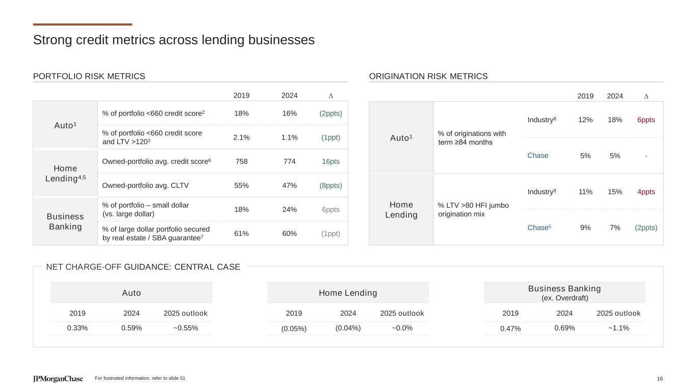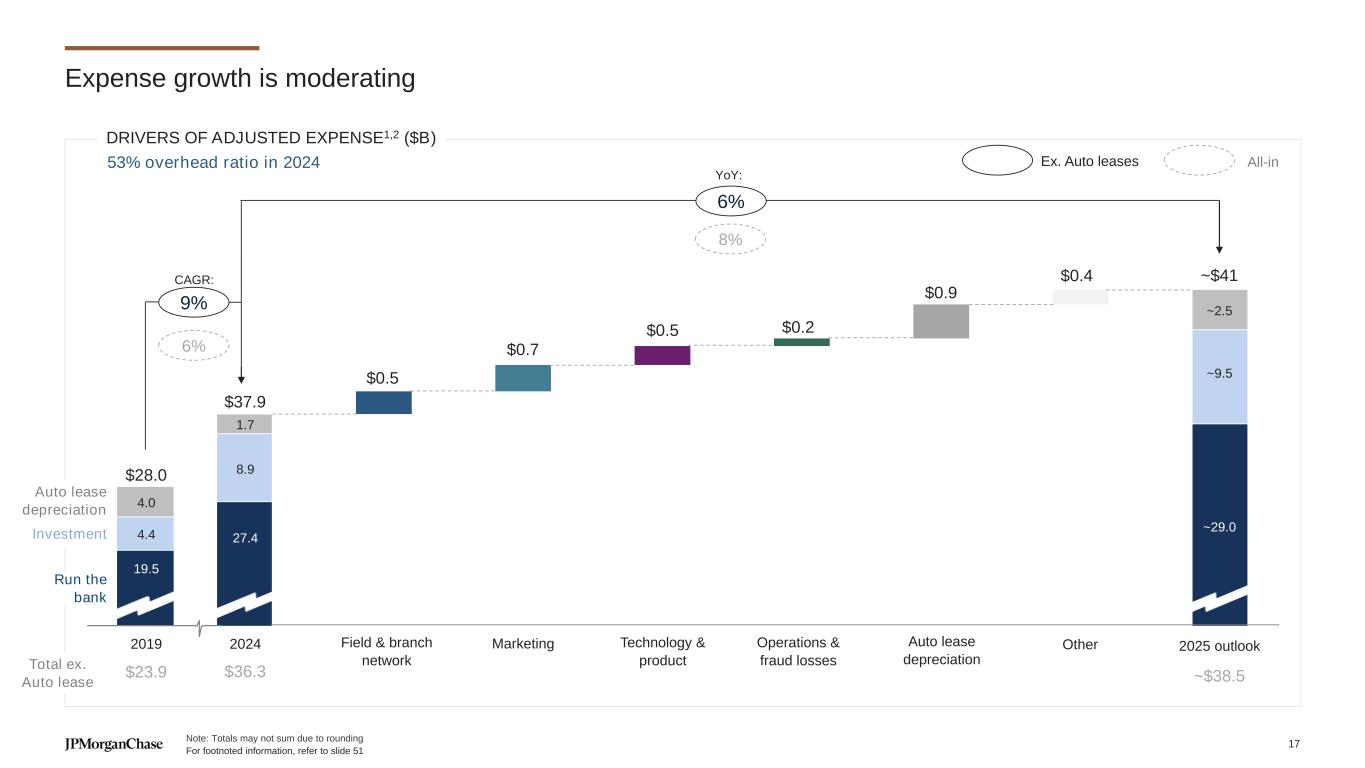 Strong credit metrics across lending businesses 2019 2024 ∆ Auto1 % of portfolio <660 credit score2 18% 16% (2ppts) % of portfolio <660 credit score and LTV >1203 2.1% 1.1% (1ppt) Home Lending4,5 Owned-portfolio avg. credit score6 758 774 16pts Owned-portfolio avg. CLTV 55% 47% (8ppts) Business Banking % of portfolio – small dollar (vs. large dollar) 18% 24% 6ppts % of large dollar portfolio secured by real estate / SBA guarantee7 61% 60% (1ppt) Auto Home Lending Business Banking (ex. Overdraft) 2019 2024 2025 outlook 2019 2024 2025 outlook 2019 2024 2025 outlook 0.33% 0.59% ~0.55% (0.05%) (0.04%) ~0.0% 0.47% 0.69% ~1.1% NET CHARGE-OFF GUIDANCE: CENTRAL CASE PORTFOLIO RISK METRICS 2019 2024 ∆ Auto1 % of originations with term ≥84 months Industry8 12% 18% 6ppts Chase 5% 5% - Home Lending % LTV >80 HFI jumbo origination mix Industry9 11% 15% 4ppts Chase5 9% 7% (2ppts) ORIGINATION RISK METRICS For footnoted information, refer to slide 51 16