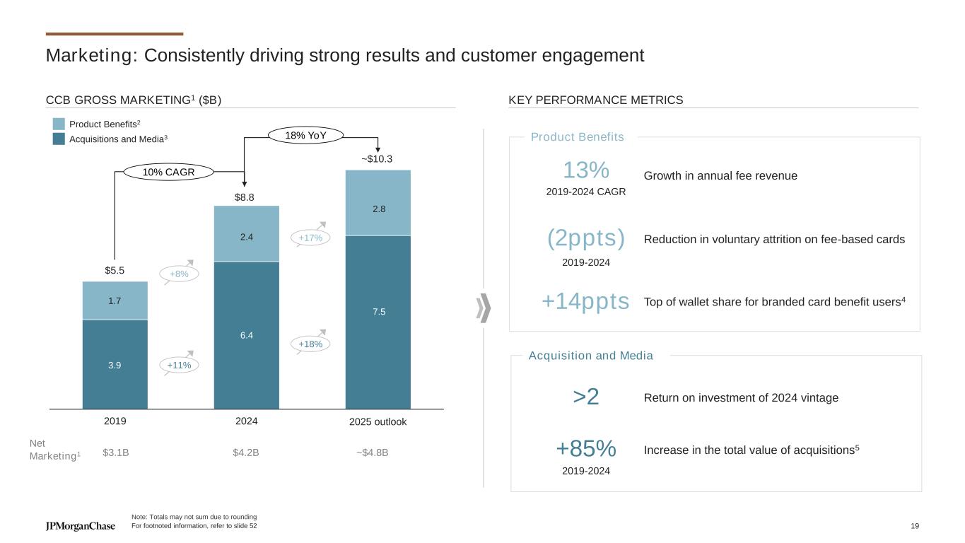 2019 2024 2025O Marketing: Consistently driving strong results and customer engagement ~$10.3 $8.8 +85% Increase in the total value of acquisitions5 (2ppts) Reduction in voluntary attrition on fee-based cards +14ppts Top of wallet share for branded card benefit users4 >2 Return on investment of 2024 vintage 2019-2024 13% Growth in annual fee revenue 2019-2024 CAGR 2019-2024 Acquisition and Media $5.5 10% CAGR 18% YoY +8% +11% +18% +17% Net Marketing1 $3.1B $4.2B ~$4.8B CCB GROSS MARKETING1 ($B) KEY PERFORMANCE METRICS Product Benefits Product Benefits2 Acquisitions and Media3 2025 outlook 1.7 3.9 2.4 6.4 2.8 7.5 Note: Totals may not sum due to rounding For footnoted information, refer to slide 52 19