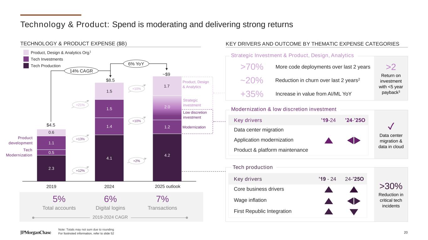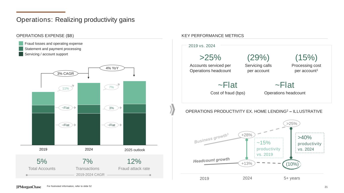 $4.5 $8.5 ~$9 2.3 4.1 4.2 0.5 1.4 1.2 1.1 1.5 2.0 0.6 1.5 1.7 2019 2024 2025O >2 Return on investment with <5 year payback3 >30% Reduction in critical tech incidents ✓ Data center migration & data in cloud Technology & Product: Spend is moderating and delivering strong returns TECHNOLOGY & PRODUCT EXPENSE ($B) 5% Total accounts 7% Transactions 6% Digital logins Tech Modernization Product development +12% +2% +13% +21% +10% +10% 1 Key drivers ’19 - 24 24-’25O Core business drivers Wage inflation First Republic Integration Key drivers ’19-24 ’24-’25O Data center migration Application modernization Product & platform maintenance Tech production Modernization & low discretion investment Strategic Investment & Product, Design, Analytics More code deployments over last 2 years>70% Reduction in churn over last 2 years2~20% Increase in value from AI/ML YoY+35% KEY DRIVERS AND OUTCOME BY THEMATIC EXPENSE CATEGORIES 14% CAGR 6% YoY 2019-2024 CAGR Tech Investments Tech Production Product, Design & Analytics Org. Strategic investment Low discretion investment Modernization Product, Design & Analytics 20 5 outlook Note: Totals may not sum due to rounding For footnoted information, refer to slide 52 20